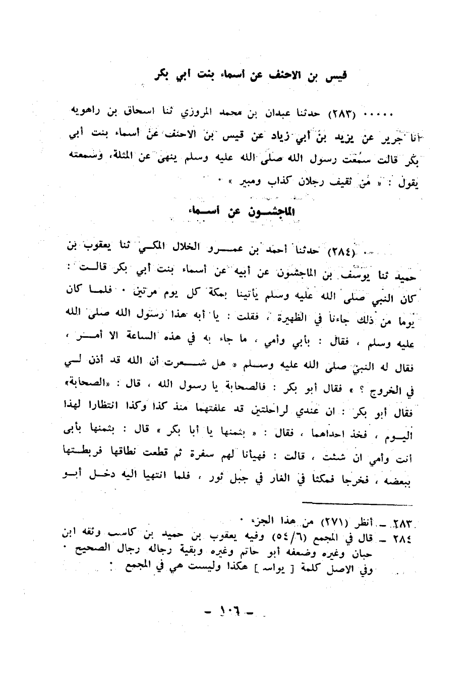 284 - حَدَّثَنَا أَحْمَدُ بْنُ عَمْرٍو الْخَلَّالُ الْمَكِّيُّ، ثنا يَعْقُوبُ بْنُ حُمَيْدٍ، ثنا يُوسُفُ بْنُ الْمَاجِشُونِ، عَنْ أَبِيهِ، عَنْ أَسْمَاءَ بِنْتِ أَبِي بَكْرٍ، قَالَتْ: كَانَ النَّبِيُّ صَلَّى اللهُ عَلَيْهِ وَسَلَّمَ يَأْتِينَا بِمَكَّةَ كُلَّ يَوْمٍ مَرَّتَيْنِ، فَلَمَّا كَانَ يَوْمًا مِنْ ذَلِكَ جَاءَنَا فِي الظَّهِيرَةِ، فَقُلْتُ: يَا أَبَةُ، هَذَا رَسُولُ اللهِ صَلَّى اللهُ عَلَيْهِ وَسَلَّمَ، فَقَالَ: بِأَبِي وَأُمِّي مَا جَاءَ بِهِ فِي هَذِهِ السَّاعَةِ إِلَّا أَمَرٌ، فَقَالَ لَهُ النَّبِيُّ صَلَّى اللهُ عَلَيْهِ وَسَلَّمَ: «§هَلْ شَعَرْتَ أَنَّ اللهَ قَدْ أَذِنَ لِي فِي الْخُرُوجِ؟» فَقَالَ أَبُو بَكْرٍ: فَالصَّحَابَةُ يَا رَسُولَ اللهِ، قَالَ: «الصَّحَابَةُ» فَقَالَ أَبُو بَكْرٍ: إِنَّ عِنْدِي لَرَاحِلَتَيْنِ قَدْ عَلَفْتُهُمَا مُنْذُ كَذَا وَكَذَا انْتِظَارًا لِهَذَا الْيَوْمِ، فَخُذْ إِحْدَاهُمَا، فَقَالَ: «بِثَمَنِهَا يَا أَبَا بَكْرٍ» قَالَ: بِثَمَنِهَا بِأَبِي أَنْتَ وَأُمِّي إِنْ شِئْتَ، قَالَتْ: فَهَيَّأْنَا لَهُمْ سَفْرَةً، ثُمَّ قَطَعَتْ نِطَاقَهَا فَرَبَطَتْهَا بِبَعْضِهِ فَخَرَجَا فَمَكَثَا فِي الْغَارِ فِي جَبَلِ ثَوْرٍ، فَلَمَّا انْتَهَيَا إِلَيْهِ دَخَلَ أَبُو -[107]- بَكْرٍ الْغَارَ قَبْلَهُ، فَلَمْ يَتْرُكْ فِيهِ جُحْرًا إِلَّا أَدْخَلَ فِيهِ أَصْبُعَهُ مَخَافَةَ أَنْ يَكُونَ فِيهِ هَامَةً، وَخَرَجَتْ قُرَيْشُ حِينَ فَقَدُوهُمَا فِي بِغَائِهِمَا، وَجَعَلُوا فِي النَّبِيِّ صَلَّى اللهُ عَلَيْهِ وَسَلَّمَ مِائَةَ نَاقَةٍ، وَخَرَجُوا يَطُوفُونَ فِي جِبَالِ مَكَّةَ حَتَّى انْتَهَوْا إِلَى الْجَبَلِ الَّذِي هُمَا فِيهِ، فَقَالَ أَبُو بَكْرٍ لِرَجُلٍ يَرَاهُ مُوَاجِهَ الْغَارِ: يَا رَسُولَ اللهِ إِنَّهُ لَيَرَانَا، فَقَالَ: «كَلَّا إِنَّ مَلَائِكَةً تَسْتُرُنَا بِأَجْنِحَتِهَا» فَجَلَسَ ذَلِكَ الرَّجُلُ فَبَالَ مُوَاجِهَ الْغَارِ فَقَالَ النَّبِيُّ صَلَّى اللهُ عَلَيْهِ وَسَلَّمَ: «لَوْ كَانَ يَرَانَا مَا فَعَلَ هَذَا» فَمَكَثَا ثَلَاثَ لَيَالٍ يَرُوحُ عَلَيْهِمَا عَامِرُ بْنُ فُهَيْرَةَ مَوْلَى أَبِي بَكْرٍ غَنَمًا لِأَبِي بَكْرٍ، وَيُدْلِجُ مِنْ عِنْدِهِمَا، فَيُصْبِحُ مَعَ الرُّعَاةِ فِي مَرَاعِهَا، وَيَرُوحُ مَعَهُمْ وَيَتَطَأْطَأُ فِي الْمَشْيِ حَتَّى إِذَا أَظْلَمَ انْصَرَفَ بِغَنَمِهِ إِلَيْهِمَا، فَيَظُنُّ الرُّعَاةُ أَنَّهُ مَعَهُمْ، وَعَبْدُ اللهِ بْنُ أَبِي بَكْرٍ يَظَلُّ بِمَكَّةَ يَبْطُشُ الْأَخْبَارَ، ثُمَّ يَأْتِيَهُمَا إِذَا أَظْلَمَ فَيُخْبِرْهُمَا، ثُمَّ يُدْلِجُ مِنْ عِنْدِهِمَا فَيُصْبِحُ بِمَكَّةَ كَبَائِتٍ، ثُمَّ خَرَجَا مِنَ الْغَارِ فَأَخَذَا عَلَى السَّاحِلِ فَجَعَلَ أَبُو بَكْرٍ يَسِيرُ أَمَامَهُ، فَإِذَا خَشِيَ أَنْ يُؤْتَى مِنْ خَلْفِهِ سَارَ خَلْفَهُ فَلَمْ يَزَلْ كَذَلِكَ مَسِيرُهُ، وَكَانَ أَبُو بَكْرٍ رَجُلًا مَعْرُوفًا فِي النَّاسِ، فَإِذَا لَقِيَهُ لَاقٍ قَالَ لِأَبِي بَكْرٍ: مَنْ هَذَا مَعَكَ؟ فَيَقُولُ: هَادٍ يَهْدِينِي، يُرِيدُ الْهِدَايَةَ فِي الدِّينِ وَيَحْسَبُهُ الْآخَرُ دَلِيلًا، حَتَّى إِذَا كَانَا بِأَبْيَاتِ قُدَيْدٍ وَكَانَ عَلَى طَرِيقِهِمَا عَلَى السَّاحِلِ جَاءَ إِنْسَانٌ إِلَى مَجْلِسِ بَنِي مُدْلِجٍ، فَقَالَ: قَدْ رَأَيْتُ رَاكِبَيْنِ نَحْوَ السَّاحِلِ، فَإِنِّي أَرَى أَحَدَهُمَا لَصَاحِبُ قُرَيْشٍ الَّذِي يَبْغُونَ، فَقَالَ سُرَاقَةُ بْنُ مَالِكٍ: ذَانِكَ رَاكِبَانِ مِمَّنْ بَعَثْنَا فِي طَلَبِهِ يُواسِ الْقَوْمَ، ثُمَّ دَعَا جَارِيَتَهُ فَسَارَّهَا فَأَمَرَهَا أَنْ تَخْرُجَ بِفَرَسِهِ وَتَحُطُّ رُمْحَهُ وَلَا تَنُصُبُهُ حَتَّى يَأْتِيَهُ فِي قَرَارِهِ بِمَوْضُوع