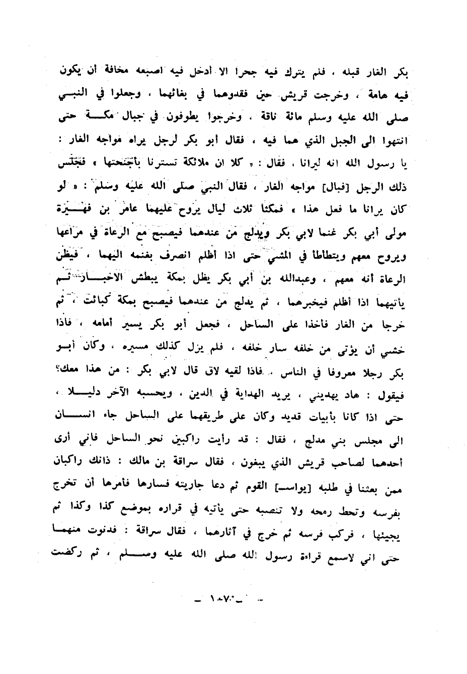 وَخَرَجُوا يَطُوفُونَ فِي جِبَالِ مَكَّةَ حَتَّى انْتَهَوْا إِلَى الْجَبَلِ الَّذِي هُمَا فِيهِ ، فَقَالَ أَبُو بَكْرٍ لِرَجُلٍ يَرَاهُ مُوَاجِهَ الْغَارِ : يَا رَسُولَ اللهِ إِنَّهُ لَيَرَانَا ، فَقَالَ : كَلاَّ إِنَّ مَلاَئِكَةً تَسْتُرُنَا بِأَجْنِحَتِهَا فَجَلَسَ ذَلِكَ الرَّجُلُ فَبَالَ مُوَاجِهَ الْغَارِ فَقَالَ النَّبِيُّ صَلَّى اللَّهُ عَلَيْهِ وَسَلَّمَ : لَوْ كَانَ يَرَانَا مَا فَعَلَ هَذَا فَمَكَثَا ثَلاَثَ لَيَالٍ يَرُوحُ عَلَيْهِمَا عَامِرُ بْنُ فُهَيْرَةَ مَوْلَى أَبِي بَكْرٍ غَنَمًا لأَبِي بَكْرٍ ، وَيُدْلِجُ مِنْ عِنْدِهِمَا ، فَيُصْبِحُ مَعَ الرُّعَاةِ فِي مَرَاعِهَا ، وَيَرُوحُ مَعَهُمْ وَيَتَطَأْطَأُ فِي الْمَشْيِ حَتَّى إِذَا أَظْلَمَ انْصَرَفَ بِغَنَمِهِ إِلَيْهِمَا ، فَيَظُنُّ الرُّعَاةُ أَنَّهُ مَعَهُمْ ، وَعَبْدُ اللهِ بْنُ أَبِي بَكْرٍ يَظَلُّ بِمَكَّةَ يَبْطُشُ الأَخْبَارَ ، ثُمَّ يَأْتِيَهُمَا إِذَا أَظْلَمَ فَيُخْبِرْهُمَا ، ثُمَّ يُدْلِجُ مِنْ عِنْدِهِمَا فَيُصْبِحُ بِمَكَّةَ كَبَائِتٍ ، ثُمَّ خَرَجَا مِنَ الْغَارِ فَأَخَذَا عَلَى السَّاحِلِ فَجَعَلَ أَبُو بَكْرٍ يَسِيرُ أَمَامَهُ ، فَإِذَا خَشِيَ أَنْ يُؤْتَى مِنْ خَلْفِهِ سَارَ خَلْفَهُ فَلَمْ يَزَلْ كَذَلِكَ مَسِيرُهُ ، وَكَانَ أَبُو بَكْرٍ رَجُلاً مَعْرُوفًا فِي النَّاسِ ، فَإِذَا لَقِيَهُ لاَقٍ قَالَ لأَبِي بَكْرٍ : مَنْ هَذَا مَعَكَ ؟ فَيَقُولُ : هَادٍ يَهْدِينِي ، يُرِيدُ الْهِدَايَةَ فِي الدِّينِ وَيَحْسَبُهُ الآخَرُ دَلِيلاً ، حَتَّى إِذَا كَانَا بِأَبْيَاتِ قُدَيْدٍ وَكَانَ عَلَى طَرِيقِهِمَا عَلَى السَّاحِلِ جَاءَ إِنْسَانٌ إِلَى مَجْلِسِ بَنِي مُدْلِجٍ ، فَقَالَ : قَدْ رَأَيْتُ رَاكِبَيْنِ نَحْوَ السَّاحِلِ ، فَإِنِّي أَرَى أَحَدَهُمَا لَصَاحِبُ قُرَيْشٍ الَّذِي يَبْغُونَ ، فَقَالَ سُرَاقَةُ بْنُ مَالِكٍ : ذَانِكَ رَاكِبَانِ مِمَّنْ بَعَثْنَا فِي طَلَبِهِ يُواسِ الْقَوْمَ ، ثُمَّ دَعَا جَارِيَتَهُ فَسَارَّهَا فَأَمَرَهَا أَنْ تَخْرُجَ بِفَرَسِهِ وَتَحُطُّ رُمْحَهُ وَلاَ تَنُصُبُهُ حَتَّى يَأْتِيَهُ فِي قَرَارِهِ بِمَوْضُوعِ كَذَا وَكَذَا ،