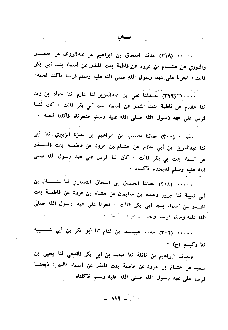 298 - حَدَّثَنَا إِسْحَاقُ بْنُ إِبْرَاهِيمَ، عَنْ عَبْدِ الرَّزَّاقِ، عَنْ مَعْمَرٍ، وَالثَّوْرِيِّ، عَنْ هِشَامِ بْنِ عُرْوَةَ، عَنْ فَاطِمَةَ بِنْتِ الْمُنْذِرِ، عَنْ أَسْمَاءَ بِنْتِ أَبِي بَكْرٍ، قَالَتْ: «§نَحَرْنَا عَلَى عَهْدِ رَسُولِ اللهِ صَلَّى اللهُ عَلَيْهِ وَسَلَّمَ فَرَسًا فَأَكَلْنَا لَحْمَهُ»