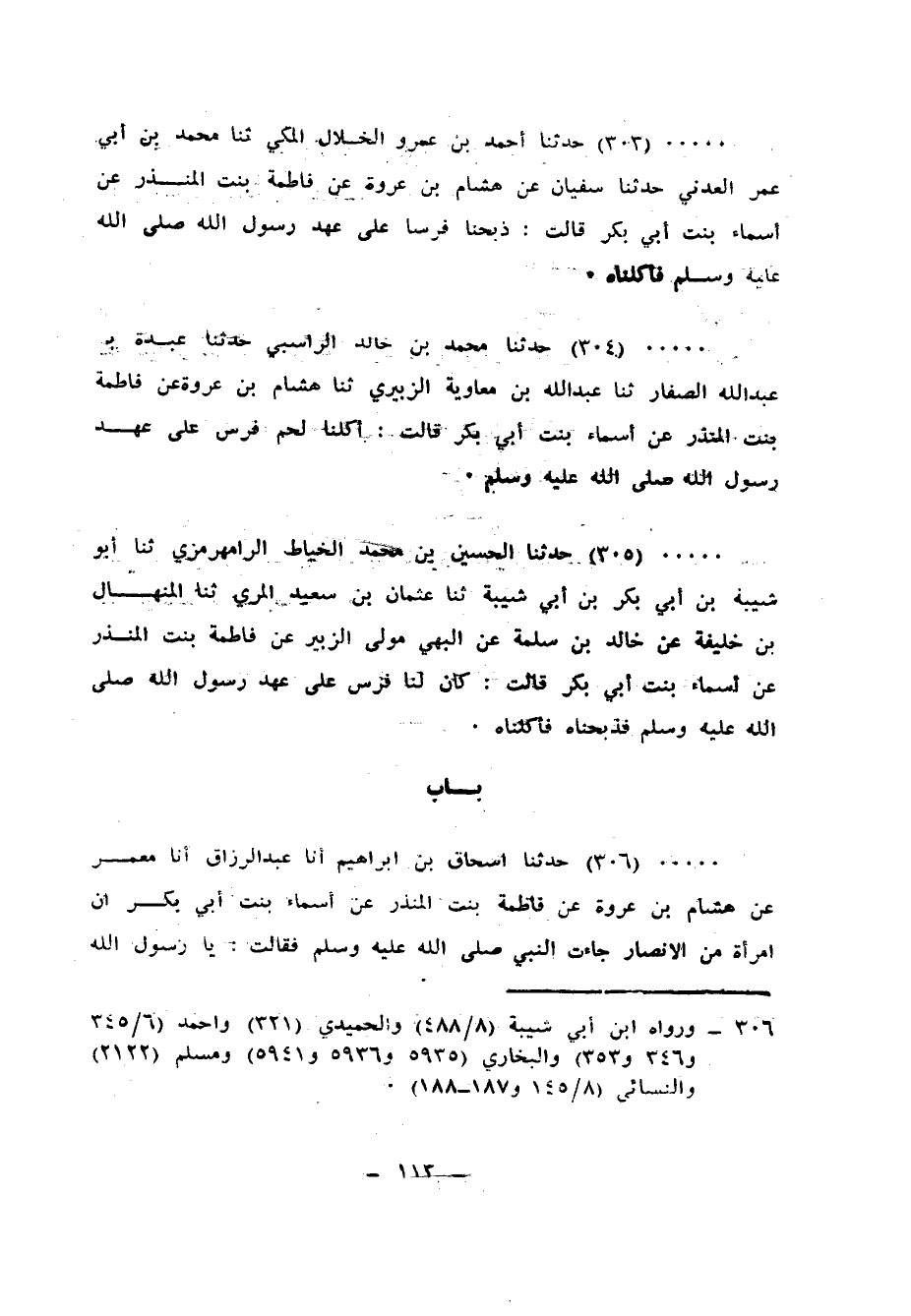 304 - حَدَّثَنَا مُحَمَّدُ بْنُ خَالِدٍ الرَّاسِبِيُّ، حَدَّثَنَا عَبْدَةُ بْنُ عَبْدِ اللهِ الصَّفَّارُ، ثنا عَبْدُ اللهِ بْنُ مُعَاوِيَةَ الزُّبَيْرِيُّ، ثنا هِشَامُ بْنُ عُرْوَةَ، عَنْ فَاطِمَةَ بِنْتِ الْمُنْذِرِ، عَنْ أَسْمَاءَ بِنْتِ أَبِي بَكْرٍ، قَالَتْ: «§أَكَلْنَا لَحْمَ فَرَسٍ عَلَى عَهْدِ رَسُولِ اللهِ صَلَّى اللهُ عَلَيْهِ وَسَلَّمَ»