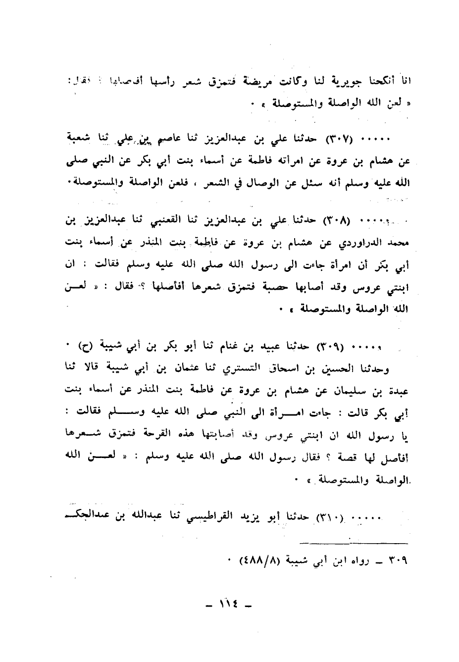 309 - حَدَّثَنَا عُبَيْدُ بْنُ غَنَّامٍ، ثنا أَبُو بَكْرِ بْنُ أَبِي شَيْبَةَ، ح وَحَدَّثَنَا الْحُسَيْنُ بْنُ إِسْحَاقَ التُّسْتَرِيُّ، ثنا عُثْمَانُ بْنُ أَبِي شَيْبَةَ، قَالَا: ثنا عَبْدَةُ بْنُ سُلَيْمَانَ، عَنْ هِشَامِ بْنِ عُرْوَةَ، عَنْ فَاطِمَةَ بِنْتِ الْمُنْذِرِ، عَنْ أَسْمَاءَ بِنْتِ أَبِي بَكْرٍ، قَالَتْ: جَاءَتِ امْرَأَةٌ إِلَى النَّبِيِّ صَلَّى اللهُ عَلَيْهِ وَسَلَّمَ فَقَالَتْ: يَا رَسُولَ اللهِ، إِنَّ ابْنَتِي عَرُوسٌ وَقَدْ أَصَابَتْهَا هَذِهِ الْقُرْحَةُ، فَتَمَزَّقَ شَعْرُهَا أَفَأَصِلُ لَهَا قَصَّةً؟ فَقَالَ رَسُولُ اللهِ صَلَّى اللهُ عَلَيْهِ وَسَلَّمَ: «§لَعَنَ اللهُ الْوَاصِلَةَ وَالْمُسْتَوْصِلَةَ»