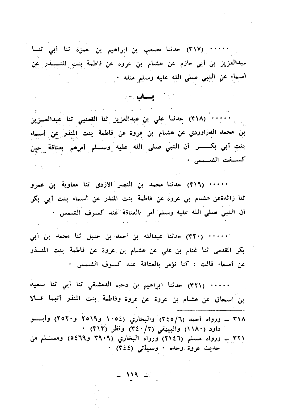 318 - حَدَّثَنَا عَلِيُّ بْنُ عَبْدِ الْعَزِيزِ، ثنا الْقَعْنَبِيُّ، ثنا عَبْدُ الْعَزِيزِ بْنُ مُحَمَّدٍ الدَّرَاوَرْدِيُّ، عَنْ هِشَامِ بْنِ عُرْوَةَ، عَنْ فَاطِمَةَ بِنْتِ الْمُنْذِرِ، عَنْ أَسْمَاءَ بِنْتِ أَبِي بَكْرٍ، «أَنَّ النَّبِيَّ صَلَّى اللهُ عَلَيْهِ وَسَلَّمَ §أَمَرَهُمْ بِعِتَاقَةٍ حِينَ كُسِفَتِ الشَّمْسُ»