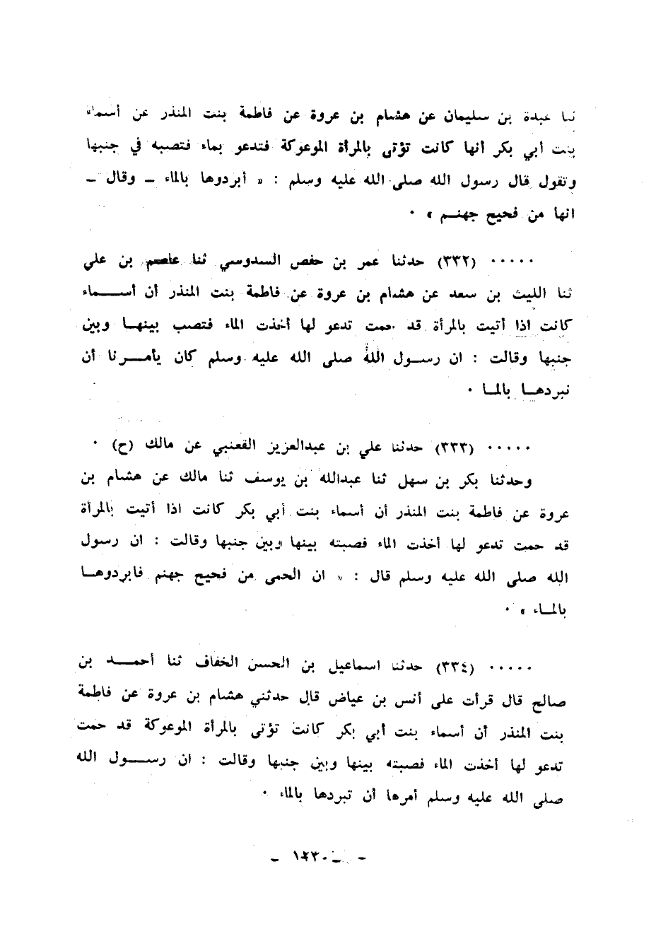332 - حَدَّثَنَا عُمَرُ بْنُ حَفْصٍ السَّدُوسِيُّ، ثنا عَاصِمُ بْنُ عَلِيٍّ، ثنا اللَّيْثُ بْنُ سَعْدٍ، عَنْ هِشَامِ بْنِ عُرْوَةَ، عَنْ فَاطِمَةَ بِنْتِ الْمُنْذِرِ، أَنَّ أَسْمَاءَ، كَانَتْ إِذَا أُتِيَتْ بِالْمَرْأَةِ قَدْ حُمَّتْ تَدْعُو لَهَا أَخَذَتِ الْمَاءَ فَتَصُبُّ بَيْنَهَا وَبَيْنَ جَنْبِهَا، وَقَالَتْ: «إِنَّ رَسُولَ اللهِ صَلَّى اللهُ عَلَيْهِ وَسَلَّمَ كَانَ §يَأْمُرُنَا أَنْ نُبْرِدَهَا بِالْمَاءِ»