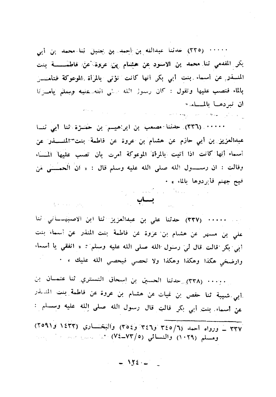 335 - حَدَّثَنَا عَبْدُ اللهِ بْنُ أَحْمَدَ بْنِ حَنْبَلٍ، ثنا مُحَمَّدُ بْنُ أَبِي بَكْرٍ الْمُقَدَّمِيُّ، ثنا مُحَمَّدُ بْنُ الْأَسْوَدِ، عَنْ هِشَامِ بْنِ عُرْوَةَ، عَنْ فَاطِمَةَ بِنْتِ الْمُنْذِرِ، عَنْ أَسْمَاءَ بِنْتِ أَبِي بَكْرٍ، أَنَّهَا كَانَتْ تُؤْتَى بِالْمَرْأَةِ الْمَوْعُوكَةِ فَتَأمُرُ بِالْمَاءِ فَتَصُبُّ عَلَيْهَا، وَتَقُولُ: «كَانَ رَسُولُ اللهِ صَلَّى اللهُ عَلَيْهِ وَسَلَّمَ §يَأْمُرُنَا أَنْ نُبْرِدَهَا بِالْمَاءِ»