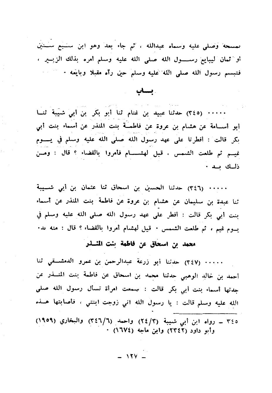 345 - حَدَّثَنَا عُبَيْدُ بْنُ غَنَّامٍ، ثنا أَبُو بَكْرِ بْنِ أَبِي شَيْبَةَ، ثنا أَبُو أُسَامَةَ، عَنْ هِشَامِ بْنِ عُرْوَةَ، عَنْ فَاطِمَةَ بِنْتِ الْمُنْذِرِ، عَنْ أَسْمَاءَ بِنْتِ أَبِي بَكْرٍ، قَالَتْ: «§أَفْطَرْنَا عَلَى عَهْدِ رَسُولِ اللهِ صَلَّى اللهُ عَلَيْهِ وَسَلَّمَ فِي يَوْمِ غَيْمٍ ثُمَّ طَلَعَتِ الشَّمْسُ» قِيلَ لِهِشَامٍ: فَأُمِرُوا بِالْقَضَاءِ؟ قَالَ: «وَمِنْ ذَلِكَ بُدٌّ»