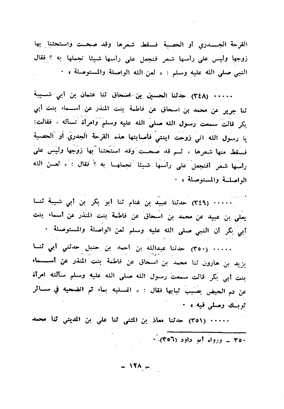 348 - حَدَّثَنَا الْحُسَيْنُ بْنُ إِسْحَاقَ، ثنا عُثْمَانُ بْنُ أَبِي شَيْبَةَ، ثنا جَرِيرٌ، عَنْ مُحَمَّدِ بْنِ إِسْحَاقَ، عَنْ فَاطِمَةَ بِنْتِ الْمُنْذِرِ، عَنْ أَسْمَاءَ بِنْتِ أَبِي بَكْرٍ، قَالَتْ: سَمِعْتُ رَسُولَ اللهِ صَلَّى اللهُ عَلَيْهِ وَسَلَّمَ وَامْرَأَةً تَسْأَلُهُ، فَقَالَتْ: يَا رَسُولَ اللهِ، إِنِّي زَوَّجَتُ ابْنَتِي فَأَصَابَتْهَا هَذِهِ الْقُرْحَةُ - الْجُدَرِيُّ أَوِ الْحَصْبَةُ - فَسَقَطَ مِنْهَا شَعَرُهَا، ثُمَّ قَدْ صَحَّتْ وَقَدِ اسْتَحَثَّنَا بِهَا زَوْجُهَا، وَلَيْسَ عَلَى رَأْسِهَا شَعَرٌ أَفَنَجْعَلُ عَلَى رَأْسِهَا شَيْئًا نُجَمِّلُهَا بِهِ؟ فَقَالَ: «§لَعَنَ اللهُ الْوَاصِلَةَ وَالْمُسْتَوْصِلَةَ»