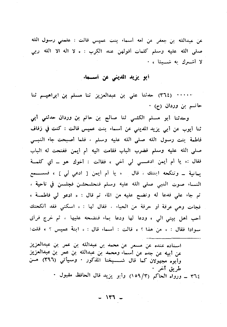 364 - حَدَّثَنَا عَلِيُّ بْنُ عَبْدِ الْعَزِيزِ، ثنا مُسْلِمُ بْنُ إِبْرَاهِيمَ، ثنا حَاتِمُ بْنُ وَرْدَانَ، ح وَحَدَّثَنَا أَبُو مُسْلِمٍ الْكَشِّيُّ، ثنا صَالِحُ بْنُ حَاتِمِ بْنِ وَرْدَانَ، حَدَّثَنِي أَبِي، ثنا أَيُّوبُ، عَنْ أَبِي يَزِيدَ الْمَدِينِيِّ، عَنْ أَسْمَاءَ بِنْتِ عُمَيْسٍ، قَالَتْ: كُنْتُ فِي زِفَافِ فَاطِمَةَ بِنْتِ رَسُولِ اللهِ صَلَّى اللهُ عَلَيْهِ وَسَلَّمَ، فَلَمَّا أَصْبَحْتُ جَاءَ النَّبِيُّ صَلَّى اللهُ عَلَيْهِ وَسَلَّمَ، فَضَرَبَ الْبَابَ فَقَامَتْ إِلَيْهِ أُمُّ أَيْمَنَ فَفَتَحَتْ لَهُ الْبَابَ، فَقَالَ: «يَا أُمَّ أَيْمَنَ، ادْعِي لِي أَخِي» فَقَالَتْ أَخُوكَ هُوَ - أَيَّ كَلِمَةٍ يَمَانِيَةٍ - وَتَنْكِحُهُ ابْنَتَكَ، قَالَ: «يَا أُمَّ أَيْمَنَ، ادْعِي لِي» ، فَسَمِعَ النِّسَاءُ صَوْتَ النَّبِيِّ صَلَّى اللهُ عَلَيْهِ وَسَلَّمَ فَتَحَشْحَشْنَ فَجَلَسْنَ فِي نَاحِيَةٍ، ثُمَّ جَاءَ عَلِيٌّ فَدَعَا لَهُ وَنَضَحَ عَلَيْهِ مِنَ الْمَاءِ، ثُمَّ قَالَ: «ادْعُو لِي فَاطِمَةَ» فَجَاءَتْ وَهِيَ عَرِقَةٌ - أَوْ حَرِقَةٌ - مِنَ الْحَيَاءِ، فَقَالَ لَهَا: «اسْكُتِي فَقَدْ §أَنْكَحْتُكِ أَحَبَّ أَهْلِ بَيْتِي إِلَيَّ» وَدَعَا لَهَا وَدَعَا بِمَاءٍ فَنَضَحَهُ عَلَيْهَا، ثُمَّ خَرَجَ فَرَأَى سَوَادًا، فَقَالَ: «مَنْ هَذَا؟» قَالَتْ: أَسْمَاءُ، قَالَ: «ابْنَةُ عُمَيْسٍ؟» قُلْتُ: نَعَمْ، قَالَ: «أَكُنْتِ فِي زِفَافِ بِنْتِ رَسُولِ اللهِ صَلَّى اللهُ عَلَيْهِ وَسَلَّمَ تُكْرِمِينَهُ؟» قُلْتُ: نَعَمْ، فَدَعَا لِي