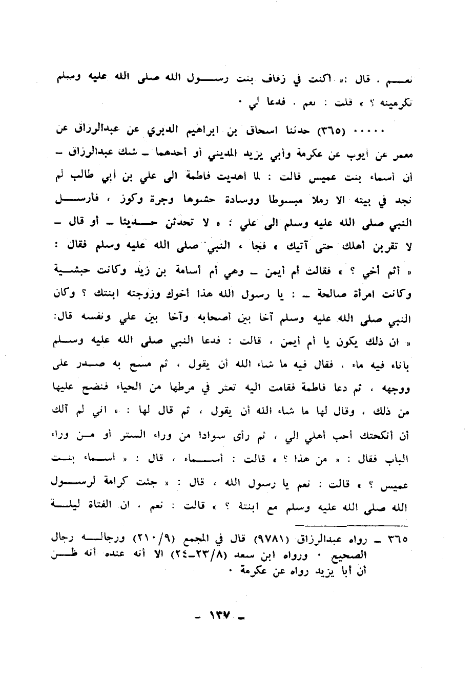 365 - حَدَّثَنَا إِسْحَاقُ بْنُ إِبْرَاهِيمَ الدَّبَرِيُّ، عَنْ عَبْدِ الرَّزَّاقِ، عَنْ مَعْمَرٍ، عَنْ أَيُّوبَ، عَنْ عِكْرِمَةَ، وَأَبِي يَزِيدَ الْمَدِينِيِّ - أَوْ أَحَدُهُمَا، شَكَّ عَبْدُ الرَّزَّاقِ - أَنَّ أَسْمَاءَ بِنْتَ عُمَيْسٍ قَالَتْ: لَمَّا أُهْدِيَتْ فَاطِمَةُ إِلَى عَلِيِّ بْنِ أَبِي طَالِبٍ لَمْ نَجِدْ فِي بَيْتِهِ إِلَّا رَمَلًا مَبْسُوطًا وَوِسَادَةً حَشَوْهَا، وَجَرَّةً وَكُوزًا، فَأَرْسَلَ النَّبِيُّ صَلَّى اللهُ عَلَيْهِ وَسَلَّمَ إِلَى عَلِيٍّ لَا تُحْدِثَنَّ حَدِيثًا، أَوْ قَالَ: «§لَا تَقْرَبَنَّ أَهْلَكَ حَتَّى آتِيَكَ» فَجَاءَ النَّبِيُّ صَلَّى اللهُ عَلَيْهِ وَسَلَّمَ فَقَالَ: «أَثَمَّ أَخِي؟» فَقَالَتْ أُمُّ أَيْمَنَ - وَهِيَ أُمُّ أُسَامَةَ بْنِ زَيْدٍ وَكَانَتْ حَبَشِيَّةً، وَكَانَتِ امْرَأَةً صَالِحَةً: يَا رَسُولَ اللهِ، هَذَا أَخُوكَ وَزَوَّجْتُهُ ابْنَتُكَ، وَكَانَ النَّبِيُّ صَلَّى اللهُ عَلَيْهِ وَسَلَّمَ آخَى بَيْنَ أَصْحَابِهِ، وَآخَى بَيْنَ عَلِيٍّ وَنَفْسِهِ قَالَ: «إِنَّ ذَلِكَ يَكُونُ يَا أُمَّ أَيْمَنَ» قَالَتْ: فَدَعَا النَّبِيُّ صَلَّى اللهُ عَلَيْهِ وَسَلَّمَ بِإِنَاءٍ فِيهِ مَاءٌ فَقَالَ فِيهِ مَا شَاءَ اللهُ أَنْ يَقُولَ، ثُمَّ مَسَحَ بِهِ صَدْرَ عَلِيٍّ وَوَجْهَهُ، ثُمَّ دَعَا فَاطِمَةَ فَقَامَتْ إِلَيْهِ تَعْثُرُ فِي مِرْطِهَا مِنَ الْحَيَاءِ، فَنَضَحَ عَلَيْهَا مِنْ ذَلِكَ، وَقَالَ لَهَا مَا شَاءَ اللهُ أَنْ يَقُولَ، ثُمَّ قَالَ لَهَا: «إِنِّي لَمْ آلُكِ أَنْ أَنْكَحْتُكِ أَحَبَّ أَهْلِي إِلَيَّ» ، ثُمَّ رَأَى سَوَادًا مِنْ وَرَاءِ السِّتْرِ - أَوْ مِنْ وَرَاءِ الْبَابِ - فَقَالَ: «مَنْ هَذَا؟» قَالَتْ: أَسْمَاءُ، قَالَ: «أَسْمَاءُ بِنْتُ عُمَيْسٍ؟» قَالَتْ: نَعَمْ يَا رَسُولَ اللهِ، قَالَ: «جِئْتِ كَرَامَةً لِرَسُولِ اللهِ صَلَّى اللهُ عَلَيْهِ وَسَلَّمَ مَعَ ابْنَتِهِ؟» قَالَتْ: نَعَمْ إِنَّ الْفَتَاةَ لَيْلَةَ يُبْنَى بِهَا لَا بُدَّ لَهَا مِنِ امْرَأَةٍ تَكُونُ قَرِيبًا مِنْهَا، إِنْ عَرَضَتْ لَهَا حَاجَةٌ أَفَضَتْ بِذَلِكَ إِلَيْهَا، قَالَتْ: فَدَعَا لِي بِدُعَاءٍ، فَإِنَّهُ لأَوْثَقُ عَمَلِي عِنْدِي، ثُمَّ قَالَ لِعَلِيٍّ: «دُونَكَ أَهْلِكَ» ، ثُمَّ خَرَجَ فَوَلَّى قَالَتْ: فَمَا زَالَ يَدْعُو لَهُمَا حَتَّى تَوَارَى فِي حِجْرِهِ