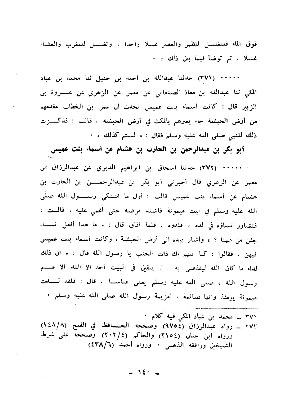 371 - حَدَّثَنَا عَبْدُ اللهِ بْنُ أَحْمَدَ بْنِ حَنْبَلٍ، ثنا مُحَمَّدُ بْنُ عَبَّادٍ الْمَكِّيُّ، ثنا عَبْدُ اللهِ بْنُ مُعَاذٍ الصَّنْعَانِيُّ، عَنْ مَعْمَرٍ، عَنِ الزُّهْرِيِّ، عَنْ عُرْوَةَ بْنِ الزُّبَيْرِ، قَالَ: كَانَتْ أَسْمَاءُ بِنْتُ عُمَيْسٍ تُحَدِّثُ، أَنَّ عُمَرَ بْنَ الْخَطَّابِ مَقْدِمَهُمْ مِنْ أَرْضِ الْحَبَشَةِ جَاءَ §يُعَيِّرُهُمْ بِالْمُكْثِ فِي أَرْضِ الْحَبَشَةِ، قَالَتْ: فَذَكَرْتُ ذَلِكَ لِلنَّبِيِّ صَلَّى اللهُ عَلَيْهِ وَسَلَّمَ فَقَالَ: «لَسْتُمْ كَذَلِكَ»