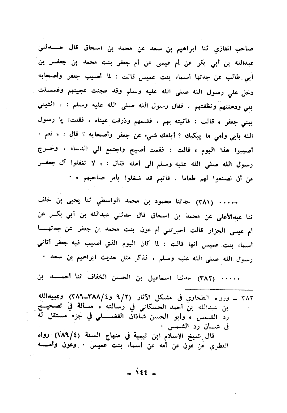 382 - حَدَّثَنَا إِسْمَاعِيلُ بْنُ الْحَسَنِ الْخَفَّافُ، ثنا أَحْمَدُ بْنُ صَالِحٍ، ثنا مُحَمَّدُ بْنُ أَبِي فُدَيْكٍ، أَخْبَرَنِي مُحَمَّدُ بْنُ مُوسَى الْفِطْرِيُّ، عَنْ عَوْنِ بْنِ مُحَمَّدٍ، عَنْ أُمِّ جَعْفَرٍ، عَنْ أَسْمَاءَ بِنْتِ عُمَيْسٍ، أَنَّ رَسُولَ اللهِ صَلَّى اللهُ عَلَيْهِ وَسَلَّمَ صَلَّى الظُّهْرَ بِالصَّهْبَاءِ، ثُمَّ أَرْسَلَ عَلِيًّا فِي حَاجَةٍ، فَرَجَعَ وَقَدْ صَلَّى النَّبِيُّ صَلَّى اللهُ عَلَيْهِ وَسَلَّمَ الْعَصْرَ، فَوَضَعَ النَّبِيُّ صَلَّى اللهُ عَلَيْهِ وَسَلَّمَ رَأْسَهُ فِي حِجْرِ عَلِيٍّ فَنَامَ، فَلَمْ يُحَرِّكُهُ حَتَّى غَابَتِ الشَّمْسُ، فَقَالَ النَّبِيُّ صَلَّى اللهُ عَلَيْهِ وَسَلَّمَ: «§اللهُمَّ إِنَّ عَبْدَكَ عَلِيًّا احْتَبَسَ بِنَفْسِهِ عَلَى نَبِيِّهِ فَرُدَّ عَلَيْهِ الشَّمْسَ» قَالَتْ: فَطَلَعَتْ عَلَيْهِ الشَّمْسُ حَتَّى رُفِعَتْ عَلَى الْجِبَالِ وَعَلَى الْأَرْضِ، وَقَامَ عَلِيٌّ فَتَوَضَّأَ وَصَلَّى الْعَصْرَ، ثُمَّ غَابَتْ وَذَلِكَ بِالصَّهْبَاءِ