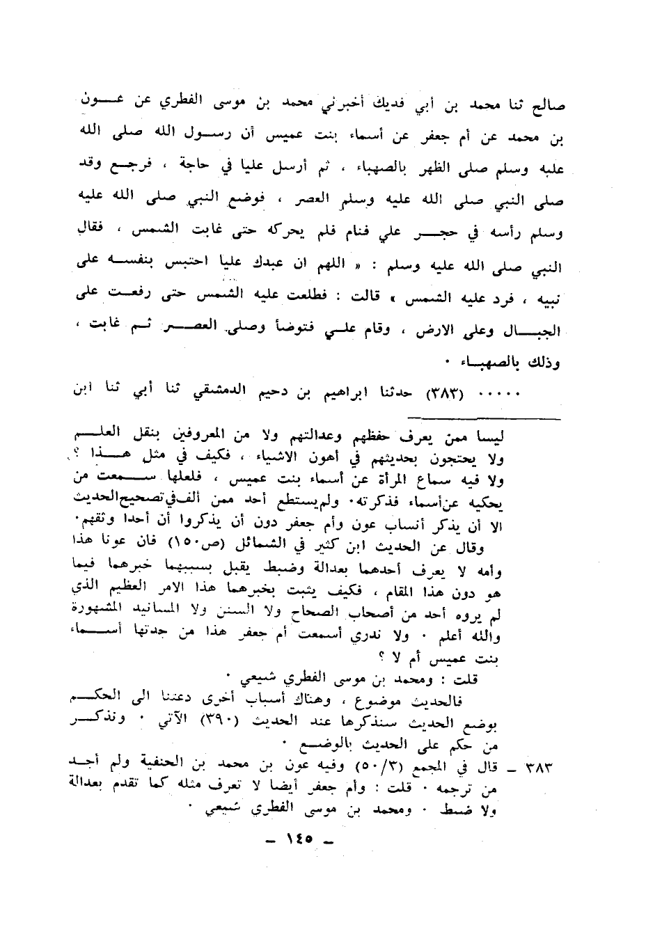 383 - حَدَّثَنَا إِبْرَاهِيمُ بْنُ دُحَيْمٍ الدِّمَشْقِيُّ، ثنا أَبِي، ثنا ابْنُ أَبِي فُدَيْكٍ، حَدَّثَنِي مُحَمَّدُ بْنُ مُوسَى الْفِطْرِيُّ، عَنْ عَوْنِ بْنِ مُحَمَّدٍ، عَنْ أُمِّهِ أُمِّ جَعْفَرٍ، عَنْ جَدَّتِهَا أَسْمَاءَ قَالَتْ: «§أُهْدِيَتْ جَدَّتُكَ فَاطِمَةُ إِلَى جَدُّكَ عَلِيٍّ رَضِيَ اللهُ عَنْهُمَا، فَمَا كَانَ حَشْوَ فِرَاشِهَا ووِسادَتِهَا إِلَّا لِيفٌ، وَلَقَدْ أَوْلَمَ عَلِيٌّ بِفَاطِمَةَ فَمَا كَانَتْ وَلِيمَتُهُ فِي ذَلِكَ الزَّمَانِ أَفْضَلَ مِنْ وَلِيمَتِهِ، رَهَنَ دِرْعَهُ عِنْدَ يَهُودِيٍّ بِشَطْرِ شَعِيرٍ»
