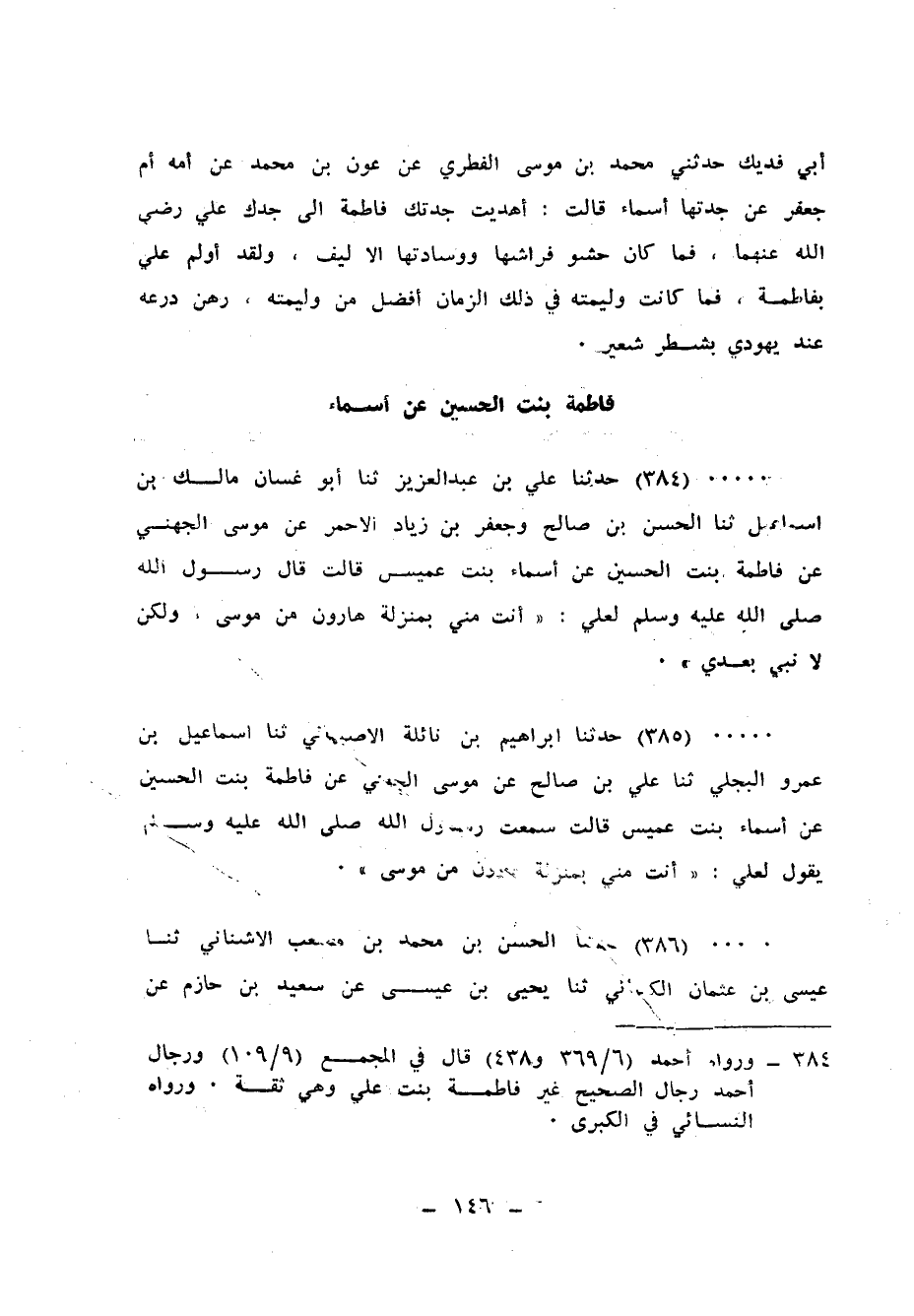 386 - حَدَّثَنَا الْحَسَنُ بْنُ مُحَمَّدِ بْنِ مُصْعَبٍ الْأَشْنَانِيُّ، ثنا عِيسَى بْنُ عُثْمَانَ الْكِسَائِي، ثنا يَحْيَى بْنُ عِيسَى، عَنْ سَعِيدِ بْنِ حَازِمٍ، عَنْ مُوسَى الْجُهَنِيِّ، عَنْ فَاطِمَةَ بِنْتِ عَلِيٍّ، قَالَتْ: سَمِعْتُ أَسْمَاءَ بِنْتَ عُمَيْسٍ، تَقُولُ: سَمِعْتُ رَسُولَ اللهِ صَلَّى اللهُ عَلَيْهِ وَسَلَّمَ يَقُولُ لِعَلِيٍّ: «§أَنْتَ مِنِّي بِمَنْزِلَةِ هَارُونَ مِنْ مُوسَى غَيْرَ أَنَّهُ لَا نَبِيَّ بَعْدِي»