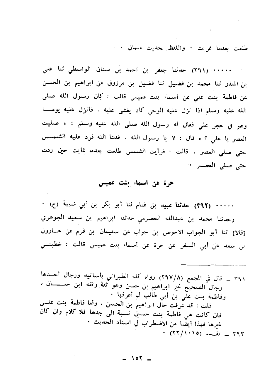 391 - حَدَّثَنَا جَعْفَرُ بْنُ أَحْمَدَ بْنِ سِنَانٍ الْوَاسِطِيُّ، ثنا عَلَى بْنُ الْمُنْذِرِ، ثنا مُحَمَّدُ بْنُ فُضَيْلٍ، ثنا فُضَيْلُ بْنُ مَرْزُوقٍ، عَنْ إِبْرَاهِيمَ بْنِ الْحَسَنِ، عَنْ فَاطِمَةَ بِنْتِ عَلِيٍّ، عَنْ أَسْمَاءَ بِنْتِ عُمَيْسٍ، قَالَتْ: كَانَ رَسُولُ اللهِ صَلَّى اللهُ عَلَيْهِ وَسَلَّمَ إِذَا نَزَلَ عَلَيْهِ الْوَحْيُ كَادَ يُغْشَى عَلَيْهِ، فَأُنْزِلَ عَلَيْهِ يَوْمًا وَهُوَ فِي حِجْرِ عَلِيٍّ، فَقَالَ لَهُ رَسُولُ اللهِ صَلَّى اللهُ عَلَيْهِ وَسَلَّمَ: «صَلَّيْتَ الْعَصْرَ يَا عَلِيُّ؟» قَالَ: لَا يَا رَسُولَ اللهِ، §فَدَعَا اللهَ فَرَدَّ عَلَيْهِ الشَّمْسَ حَتَّى صَلَّى الْعَصْرَ قَالَتْ: «فَرَأَيْتُ الشَّمْسَ طَلَعَتْ بَعْدَمَا غَابَتْ، حِينَ رُدَّتْ حَتَّى صَلَّى الْعَصْرَ»