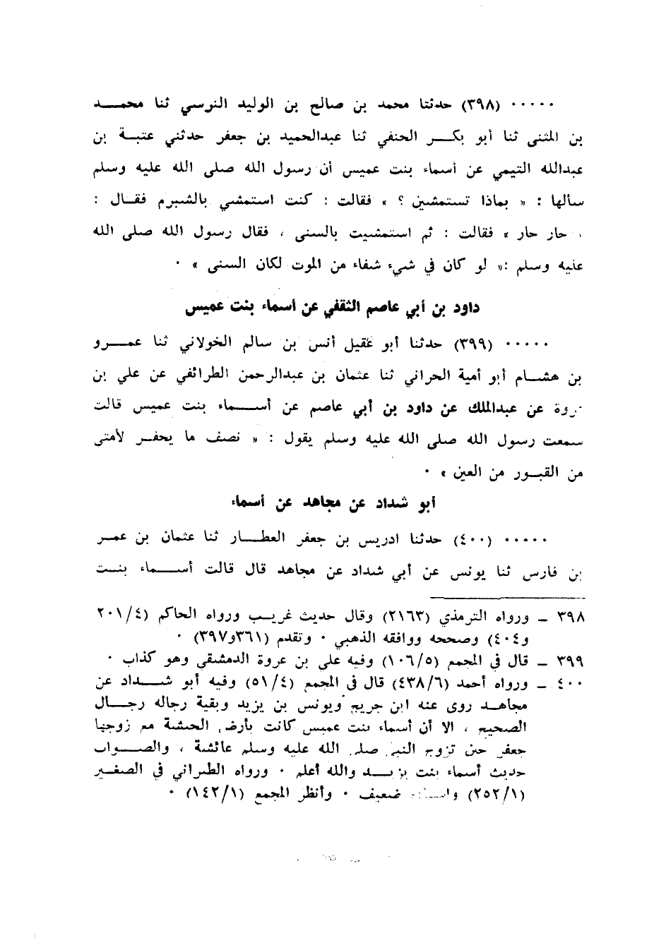 399 - حَدَّثَنَا أَبُو عَقِيلٍ أَنَسُ بْنُ سَالِمٍ الْخَوْلَانِيُّ، ثنا عَمْرُو بْنُ هِشَامٍ أَبُو أُمَيَّةَ الْحَرَّانِيُّ، ثنا عُثْمَانُ بْنُ عَبْدِ الرَّحْمَنِ الطَّرَائِفِيُّ، عَنْ عَلِيِّ بْنِ عُرْوَةَ، عَنْ عَبْدِ الْمَلِكِ، عَنْ دَاوُدَ بْنِ أَبِي عَاصِمٍ، عَنْ أَسْمَاءَ بِنْتِ عُمَيْسٍ، قَالَتْ: سَمِعْتُ رَسُولَ اللهِ صَلَّى اللهُ عَلَيْهِ وَسَلَّمَ يَقُولُ: «§نِصْفُ مَا يُحْفَرُ لِأُمَّتِي مِنَ الْقُبُورِ مِنَ الْعَيْنِ»