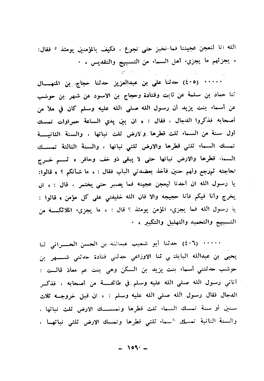 405 - حَدَّثَنَا عَلَى بْنُ عَبْدِ الْعَزِيزِ، حَدَّثَنَا حَجَّاجُ بْنُ الْمِنْهَالِ، ثنا حَمَّادُ بْنُ سَلَمَةَ، عَنْ ثَابِتٍ، وَقَتَادَةَ، وَحَجَّاجُ بْنُ الْأَسْوَدِ، عَنْ شَهْرِ بْنِ حَوْشَبٍ، عَنْ أَسْمَاءَ بِنْتِ يَزِيدَ، أَنَّ رَسُولَ اللهِ صَلَّى اللهُ عَلَيْهِ وَسَلَّمَ كَانَ فِي مَلَأٍ مِنْ أَصْحَابِهِ، فَذَكَرُوا الدَّجَّالَ فَقَالَ: «إِنَّ §بَيْنَ يَدَيَّ السَّاعَةِ حَمْرَاوَاتٍ تُمْسِكُ أَوَّلَ سَنَةٍ مِنَ السَّمَاءِ ثُلُثَ قَطْرِهَا، وَالْأَرْضِ ثُلُثَ نَبَاتِهَا، وَالسَّنَةُ الثَّانِيَةُ تُمْسِكُ السَّمَاءُ ثُلُثَيَّ قَطْرِهَا، وَالْأَرْضُ ثُلُثَيَّ نَبَاتِهَا، وَالسَّنَةُ الثَّالِثَةُ تُمْسِكُ السَّمَاءُ قَطْرَهَا، وَالْأَرْضُ نَبَاتَهَا حَتَّى لَا يَبْقَى ذُو خُفٍّ وَحَافِرٍ» ، ثُمَّ خَرَجَ لِحَاجَتِهِ ثُمَّ رَجَعَ وَلَهُمْ حَنِينٌ فَأَخَذَ بِعَضُدَتَيِّ الْبَابِ فَقَالَ: «مَا شَأْنُكُمْ؟» قَالُوا: يَا رَسُولَ اللهِ إِنَّ أَحَدَنَا لَيَعْجِنُ عَجِينَهُ فَمَا يَصْبِرُ حَتَّى يَخْتَمِرَ قَالَ: «إِنْ يَخْرُجْ وَأَنَا فِيكُمْ فَأَنَا حَجِيجُهُ، وإِلَّا فَإِنَّ اللهَ خَلِيفَتِي عَلَى كُلِّ مُؤْمِنٍ» قَالُوا: يَا رَسُولَ اللهِ فَمَا يُجْزِئُ الْمُؤْمِنَ يَوْمَئِذٍ؟ قَالَ: «مَا يُجْزِئُ الْمَلَائِكَةَ مِنَ التَّسْبِيحِ وَالتَّحْمِيدِ وَالتَّهْلِيلِ وَالتَّكْبِيرِ»