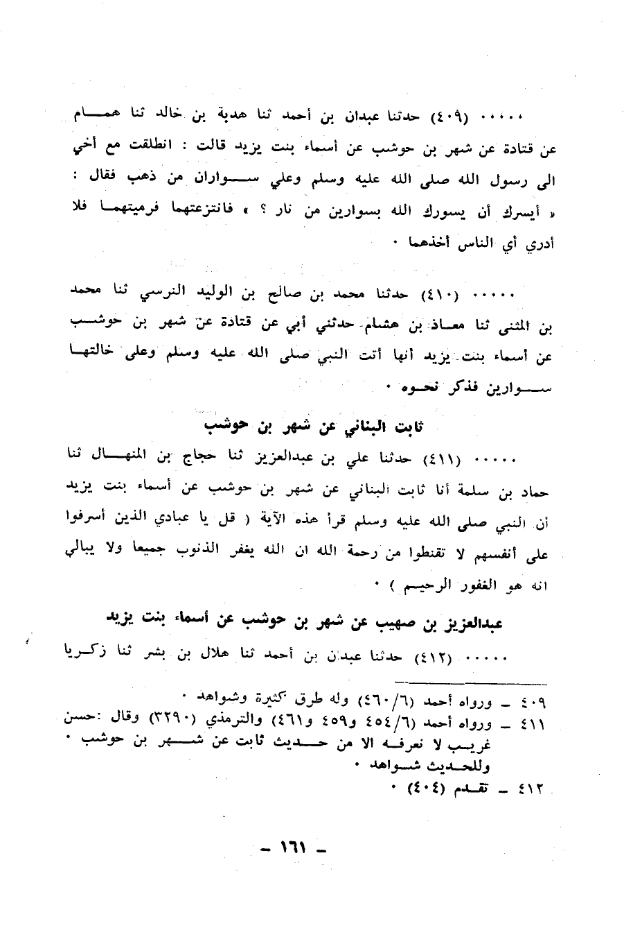 410 - حَدَّثَنَا مُحَمَّدُ بْنُ صَالِحِ بْنِ الْوَلِيدِ النَّرْسِيُّ، ثنا مُحَمَّدُ بْنُ الْمُثَنَّى، ثنا مُعَاذُ بْنُ هِشَامٍ، حَدَّثَنِي أَبِي، عَنْ قَتَادَةَ، عَنْ شَهْرِ بْنِ حَوْشَبٍ، عَنْ أَسْمَاءَ بِنْتِ يَزِيدَ، أَنَّهَا أَتَتِ النَّبِيَّ صَلَّى اللهُ عَلَيْهِ وَسَلَّمَ وَعَلَى خَالَتِهَا سِوَارَيْنِ فَذَكَرَ نَحْوَهُ