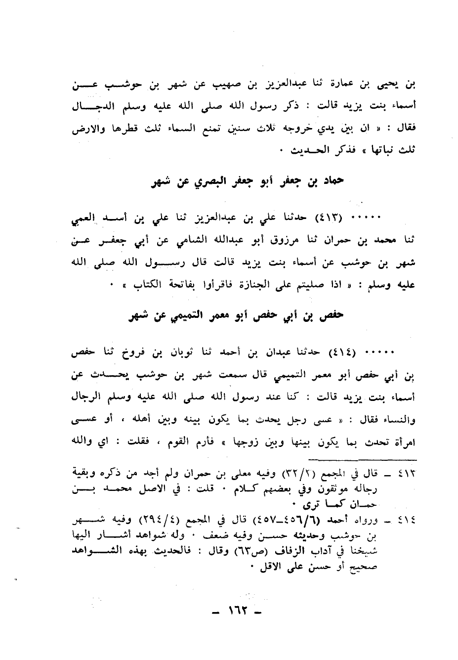 413 - حَدَّثَنَا عَلِيُّ بْنُ عَبْدِ الْعَزِيزِ، ثنا مُعَلَّى بْنُ أَسَدٍ الْعَمِّيُّ، ثنا مُحَمَّدُ بْنُ حُمْرَانَ، ثنا مَرْزُوقٌ أَبُو عَبْدِ اللهِ الشَّامِيُّ، عَنْ أَبِي جَعْفَرٍ، عَنْ شَهْرِ بْنِ حَوْشَبٍ، عَنْ أَسْمَاءَ بِنْتِ يَزِيدَ، قَالَتْ: قَالَ رَسُولُ اللهِ صَلَّى اللهُ عَلَيْهِ وَسَلَّمَ: «§إِذَا صَلَّيْتُمْ عَلَى الْجِنَازَةِ فاقْرَءُوا بِفَاتِحَةِ الْكِتَابِ»