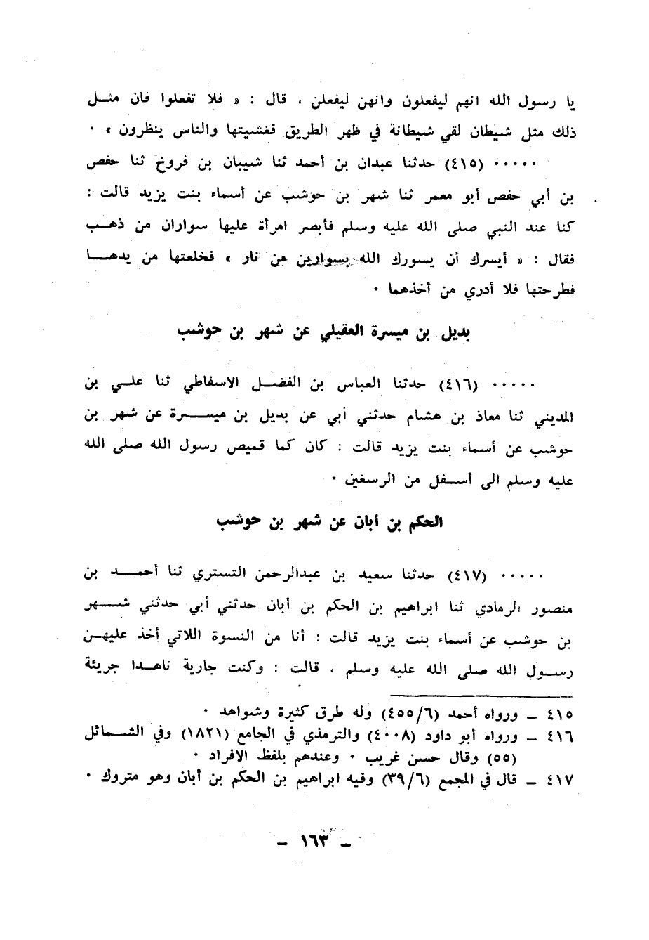 417 - حَدَّثَنَا سَعِيدُ بْنُ عَبْدِ الرَّحْمَنِ التُّسْتَرِيُّ، ثنا أَحْمَدُ بْنُ مَنْصُورٍ الرَّمَادِيُّ، ثنا إِبْرَاهِيمُ بْنُ الْحَكَمِ بْنِ أَبَانَ، حَدَّثَنِي أَبِي، حَدَّثَنِي شَهْرُ بْنُ حَوْشَبٍ، عَنْ أَسْمَاءَ بِنْتِ يَزِيدَ، قَالَتْ: أَنَا مِنَ النِّسْوَةِ اللَّاتِي أَخَذَ عَلَيْهِنَّ رَسُولُ اللهِ صَلَّى اللهُ عَلَيْهِ وَسَلَّمَ، قَالَتْ: وَكُنْتُ جَارِيَةً ناهدًا جَرِيئَةً عَلَى مَسْأَلَتِهِ، فَقُلْتُ: يَا رَسُولَ اللهِ، ابْسُطْ يَدَكَ حَتَّى أُصَافِحُكَ فَقَالَ: «§إِنِّي لَا أُصَافِحُ النِّسَاءَ، وَلَكِنْ آخُذُ عَلَيْهِنَّ مَا أَخَذَ اللهُ عَلَيْهِنَّ» قَالَتْ: وَنَظَرَ إِلَى خَالَةٍ لِي فِي يَدِهَا سِوَارَانِ مِنْ ذَهَبٍ فَأَخَذَ شَيْئًا مِنَ الْأَرْضِ فَرَمَاهَا بِهِ، فَقَالَ: «أَيَسُرُّكِ أَنْ يَجْعَلَ اللهُ لَكِ سِوَارَيْنِ مِنْ نَارِ جَهَنَّمَ؟» قَالَتْ: أَعُوذُ بِاللهِ فَقَالَ النَّبِيُّ صَلَّى اللهُ عَلَيْهِ وَسَلَّمَ: «فَإِنْ كُنْتِ تَعَوَّذْتِ بِاللهِ فَأَلْقِي هَذَيْنِ عَنْكِ» فَعَالَجْتُهُ وَأَعَنْتَهَا عَلَى ذَلِكَ فَنَبَذَتْهُ، فَمَا أَدْرِي حَتَّى السَّاعَةِ مَنْ ذَهَبَ بِهِمَا