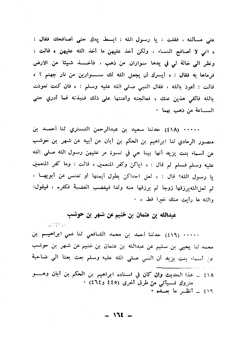 418 - حَدَّثَنَا سَعِيدُ بْنُ عَبْدِ الرَّحْمَنِ التُّسْتَرِيُّ، ثنا أَحْمَدُ بْنُ مَنْصُورٍ الرَّمَادِيُّ، ثنا إِبْرَاهِيمُ بْنُ الْحَكَمِ بْنِ أَبَانَ، عَنْ أَبِيهِ، عَنْ شَهْرِ بْنِ حَوْشَبٍ، عَنْ أَسْمَاءَ بِنْتِ يَزِيدَ، أَنَّهَا بَيْنَا هِيَ فِي نِسْوَةٍ مَرَّ عَلَيْهِنَّ رَسُولُ اللهِ صَلَّى اللهُ عَلَيْهِ وَسَلَّمَ فَسَلَّمَ ثُمَّ قَالَ: «§إِيَّاكُنَّ وَكُفْرَ الْمُنَعَّمِينَ» قَالَتْ: وَمَا كُفْرُ الْمُنَعَّمِينَ يَا رَسُولَ اللهِ؟ قَالَ: " لَعَلَّ إِحْدَاكُنَّ يَطُولُ أَيْمَتُهَا أَوْ تَعْنُسُ عَنْ أَبَوَيْهَا، ثُمَّ لَعَلَّ اللهَ يَرْزُقُهَا زَوْجًا ثُمَّ يَرْزُقُهَا مِنْهُ وَلَدًا فَيَغْضَبُ الْغَضْبَةَ فَكَفَّرَهُ فَيَقُولُ: وَاللهِ مَا رَأَيْتُ مِنْكَ خَيْرًا قَطُّ "