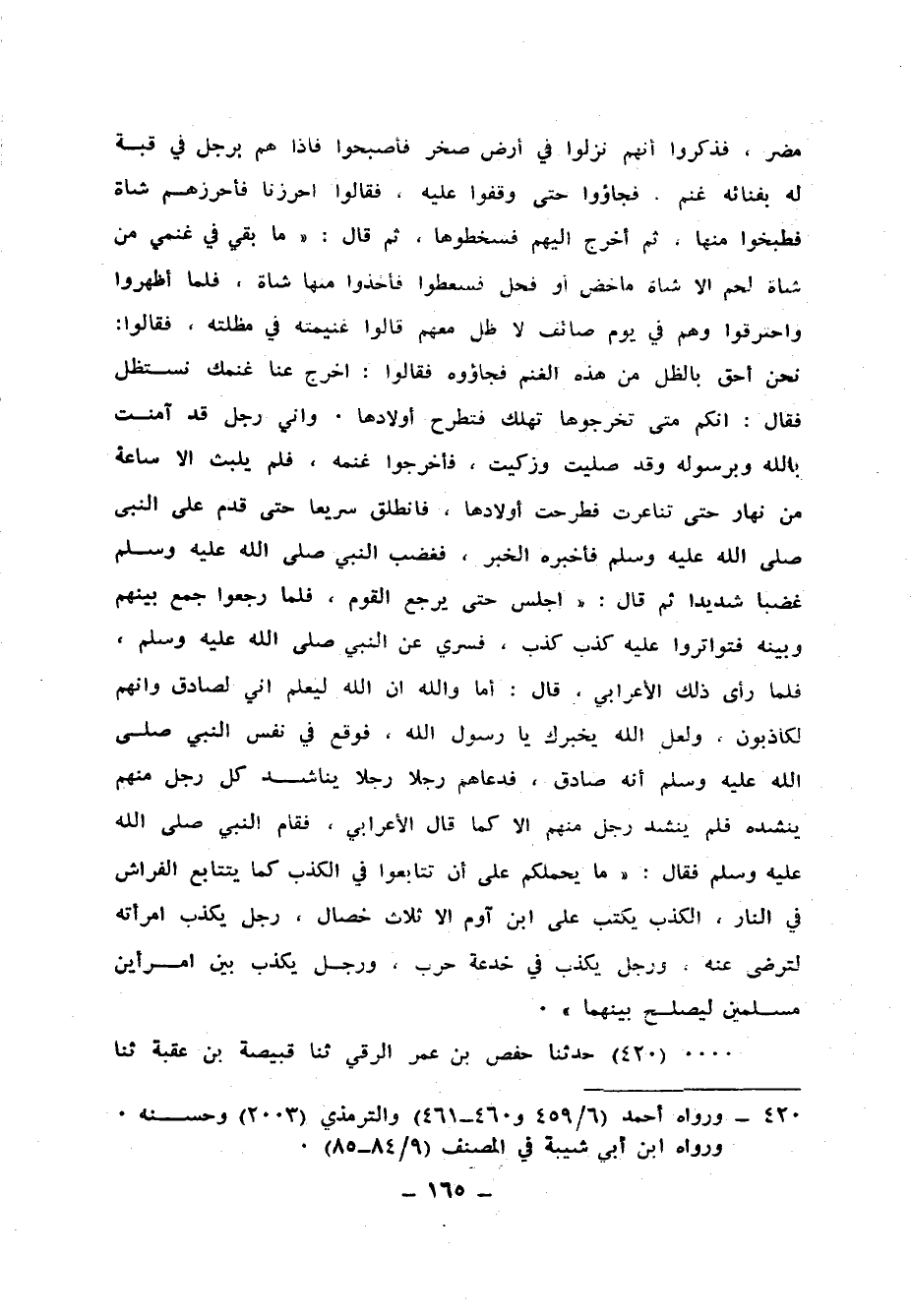420 - حَدَّثَنَا حَفْصُ بْنُ عُمَرَ الرَّقِّيُّ، ثنا قَبِيصَةُ بْنُ عُقْبَةَ، ثنا سُفْيَانُ، عَنْ عَبْدِ اللهِ بْنِ عُثْمَانَ بْنِ خُثَيْمٍ، عَنْ شَهْرِ بْنِ حَوْشَبٍ، عَنْ أَسْمَاءَ بِنْتِ يَزِيدَ، أَنَّهَا قَالَتْ: قَالَ رَسُولُ اللهِ صَلَّى اللهُ عَلَيْهِ وَسَلَّمَ: " §كُلُّ الْكَذِبِ يُكْتُبُ عَلَى ابْنِ آدَمَ إِلَّا فِي ثَلَاثٍ: رَجُلٌ يَكْذِبُ فِي إِصْلَاحِ مَا بَيْنَ النَّاسِ، أَوْ يَكْذِبُ امْرَأَتَهُ، أَوْ يَكْذِبُ فِي خَدِيعَةِ حَرْبٍ "