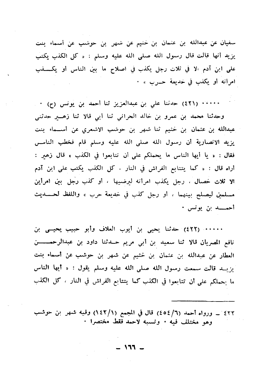 421 - حَدَّثَنَا عَلِيُّ بْنُ عَبْدِ الْعَزِيزِ، ثنا أَحْمَدُ بْنُ يُونُسَ، ح وَحَدَّثَنَا مُحَمَّدُ بْنُ عَمْرِو بْنِ خَالِدٍ الْحَرَّانِيُّ، ثنا أَبِي قَالَا: ثنا زُهَيْرٌ، حَدَّثَنِي عَبْدُ اللهِ بْنُ عُثْمَانَ بْنِ خُثَيْمٍ، ثنا شَهْرُ بْنُ حَوْشَبٍ الْأَشْعَرِيُّ، عَنْ أَسْمَاءَ بِنْتِ يَزِيدَ الْأَنْصَارِيَّةِ، أَنَّ رَسُولَ اللهِ صَلَّى اللهُ عَلَيْهِ وَسَلَّمَ قَامَ فَخَطَبَ النَّاسَ فَقَالَ: " يَا أَيُّهَا النَّاسُ، مَا يَحْمِلُكُمْ عَلَى أَنْ تَتَابَعُوا فِي الْكَذِبِ - قَالَ زُهَيْرٌ: أُرَاهُ قَالَ: - كَمَا يَتَتَابَعُ الْفَرَاشُ فِي النَّارِ، §كُلُّ الْكَذِبِ يَكْتُبُ عَلَى ابْنِ آدَمَ إِلَّا ثَلَاثَ خِصَالٍ: رَجُلٌ يَكْذِبُ امْرَأَتَهُ لِيُرْضِيَهَا، أَوْ كَذِبَ رَجُلٌ بَيْنَ امْرَأَيْنِ مُسْلِمَيْنِ لِيُصْلِحَ بَيْنَهُمَا، أَوْ رَجُلٌ كَذِبَ فِي خَدِيعَةِ حَرْبٍ " وَاللَّفْظُ لِحَدِيثِ أَحْمَدَ بْنِ يُونُسَ