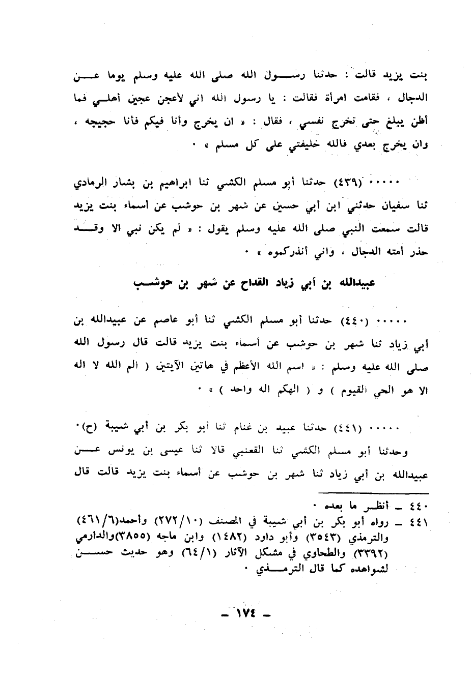 441 - حَدَّثَنَا عُبَيْدُ بْنُ غَنَّامٍ، ثنا أَبُو بَكْرِ بْنِ أَبِي شَيْبَةَ، ح وَحَدَّثَنَا أَبُو مُسْلِمٍ الْكَشِّيُّ، ثنا الْقَعْنَبِيُّ، قَالَا: ثنا عِيسَى بْنُ يُونُسَ، عَنْ عُبَيْدِ اللهِ بْنِ أَبِي زِيَادٍ، ثنا شَهْرُ بْنُ حَوْشَبٍ، عَنْ أَسْمَاءَ بِنْتِ يَزِيدَ، قَالَتْ: قَالَ رَسُولُ اللهِ صَلَّى اللهُ عَلَيْهِ وَسَلَّمَ: " §اسْمُ اللهِ الْأَعْظَمُ فِي هَاتَيْنِ الْآيَتَيْنِ: {وَإِلَهُكُمْ إِلَهٌ وَاحِدٌ} [البقرة: 163] وَ {الْم اللهُ لَا إِلَهَ إِلَّا هُوَ الْحَيُّ الْقَيُّومُ} [آل عمران: 2] "
