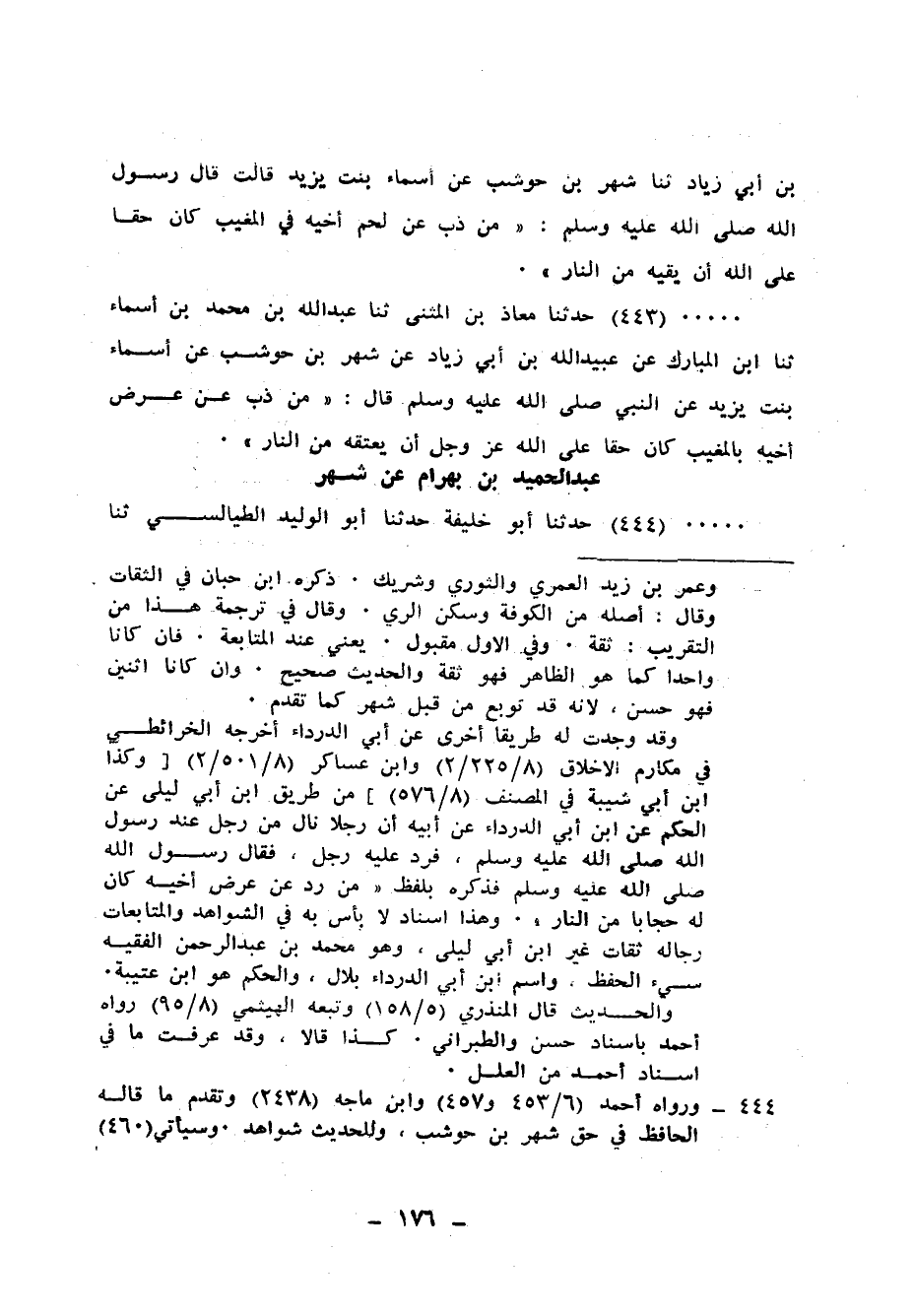 443 - حَدَّثَنَا مُعَاذُ بْنُ الْمُثَنَّى، ثنا عَبْدُ اللهِ بْنُ مُحَمَّدِ بْنِ أَسْمَاءَ، ثنا ابْنُ الْمُبَارَكِ، عَنْ عُبَيْدِ اللهِ بْنِ أَبِي زِيَادٍ، عَنْ شَهْرِ بْنِ حَوْشَبٍ، عَنْ أَسْمَاءَ بِنْتِ يَزِيدَ، عَنِ النَّبِيِّ صَلَّى اللهُ عَلَيْهِ وَسَلَّمَ قَالَ: «§مَنْ ذَبَّ عَنْ عِرْضِ أَخِيهِ بِالْمَغِيبِ كَانَ حَقًّا عَلَى اللهِ عَزَّ وَجَلَّ أَنْ يَعْتِقَهُ مِنَ النَّارِ»