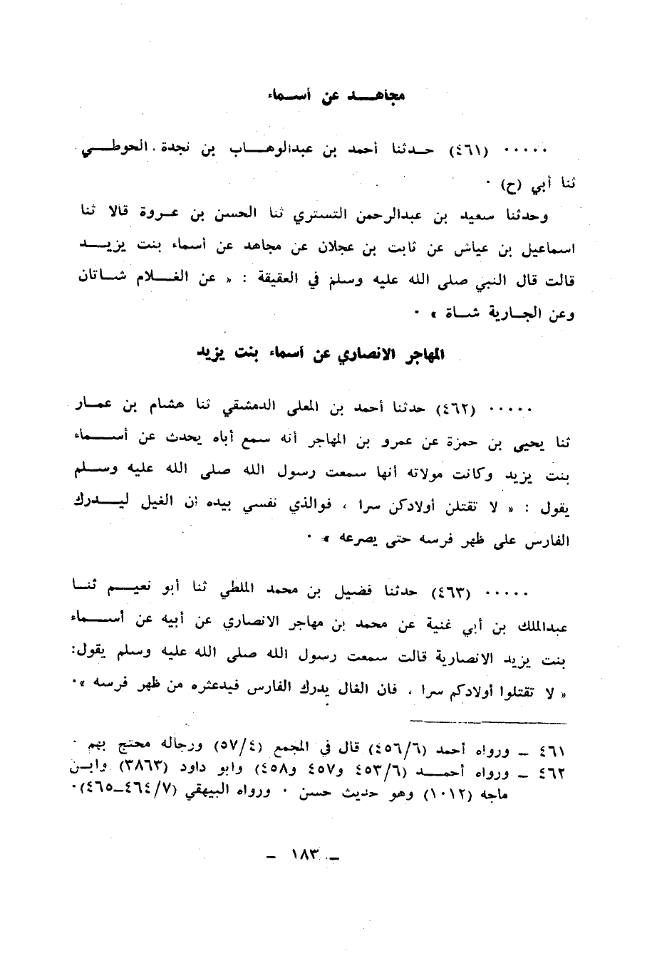 462 - حَدَّثَنَا أَحْمَدُ بْنُ الْمُعَلَّى الدِّمَشْقِيُّ، ثنا هِشَامُ بْنُ عَمَّارٍ، ثنا يَحْيَى بْنُ حَمْزَةَ، عَنْ عَمْرِو بْنِ الْمُهَاجِرِ، أَنَّهُ سَمِعَ أَبَاهُ يُحَدِّثُ، عَنْ أَسْمَاءَ بِنْتِ يَزِيدَ - وَكَانَتْ مَوْلَاتَهُ - أَنَّهَا سَمِعَتْ رَسُولَ اللهِ صَلَّى اللهُ عَلَيْهِ وَسَلَّمَ يَقُولُ: «§لَا تَقْتُلُنَّ أَوْلَادَكُنَّ سِرًّا، فَوَالَّذِي نَفْسِي بِيَدِهِ، إِنَّ الْغِيلَ لَيُدْرِكُ الْفَارِسَ عَلَى ظَهْرِ فَرَسِهِ حَتَّى يَصْرَعُهُ»