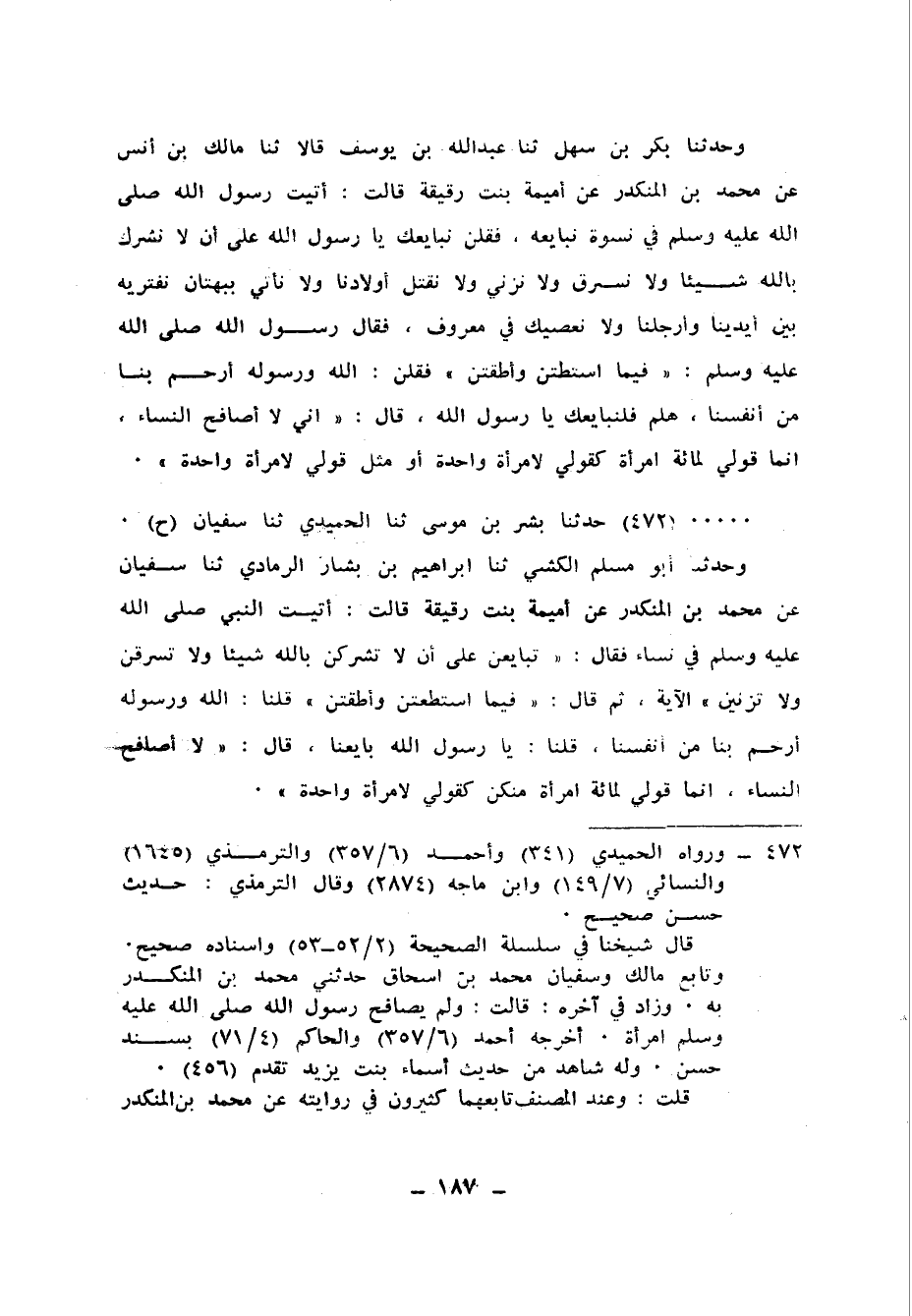 472 - حَدَّثَنَا بِشْرُ بْنُ مُوسَى، ثنا الْحُمَيْدِيُّ، ثنا سُفْيَانُ، ح وَحَدَّثَنَا أَبُو مُسْلِمٍ الْكَشِّيُّ، ثنا إِبْرَاهِيمُ بْنُ بَشَّارٍ الرَّمَادِيُّ، ثنا سُفْيَانُ، عَنْ مُحَمَّدِ بْنِ الْمُنْكَدِرِ، عَنْ أُمَيْمَةَ بِنْتِ رُقَيْقَةَ، قَالَتْ: أَتَيْتُ النَّبِيَّ صَلَّى اللهُ عَلَيْهِ وَسَلَّمَ فِي نِسَاءٍ فَقَالَ: «§تُبَايِعْنَ عَلَى أَنْ لَا تُشْرِكْنَ بِاللهِ شَيْئًا، وَلَا تَسْرِقْنَ، وَلَا تَزْنِينَ» الْآيَةُ ثُمَّ قَالَ: «فِيمَا اسْتَطَعْتُنَّ وَأَطَقْتُنَّ» قُلْنَا: اللهُ وَرَسُولُهُ أَرْحَمُ بِنَا مِنْ أَنْفُسِنَا، قُلْنَا: يَا رَسُولَ اللهِ بَايِعْنَا، قَالَ: «لَا أُصَافِحُ النِّسَاءَ إِنَّمَا قَوْلِي لِمِائَةِ امْرَأَةٍ مِنْكُنَّ كَقَوْلِي لِامْرَأَةٍ وَاحِدَةٍ»