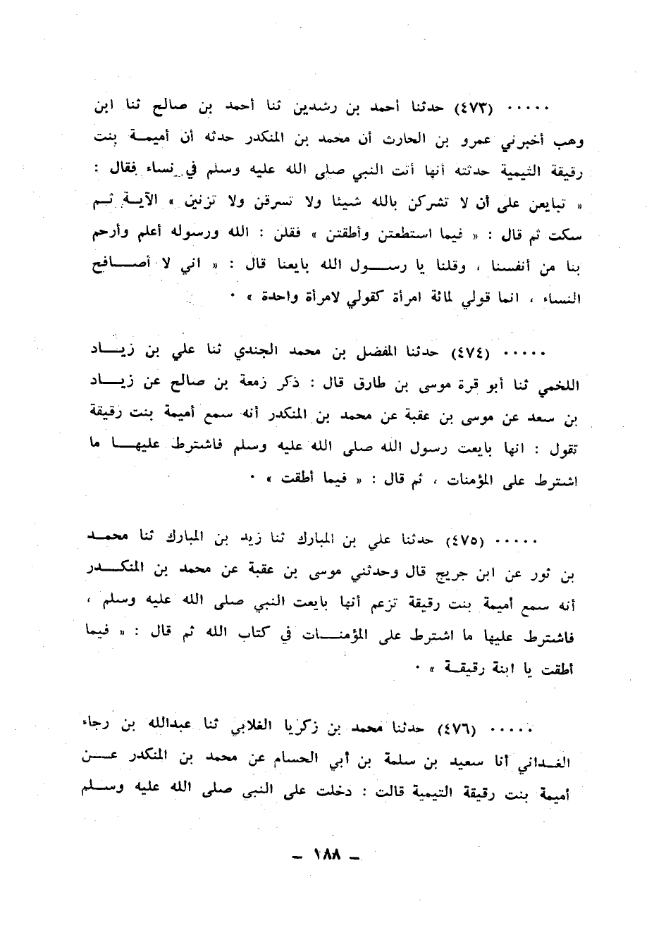 473 - حَدَّثَنَا أَحْمَدُ بْنُ رِشْدِينَ، ثنا أَحْمَدُ بْنُ صَالِحٍ، ثنا ابْنُ وَهْبٍ، أَخْبَرَنِي عَمْرُو بْنُ الْحَارِثِ أَنَّ مُحَمَّدَ بْنَ الْمُنْكَدِرِ حَدَّثَهُ، أَنَّ أُمَيْمَةَ بِنْتَ رُقَيْقَةَ التَّيْمِيَّةَ حَدَّثَتْهُ، أَنَّهَا أَتَتِ النَّبِيَّ صَلَّى اللهُ عَلَيْهِ وَسَلَّمَ فِي نِسَاءٍ فَقَالَ: «§تُبَايِعْنَ عَلَى أَنْ لَا تُشْرِكْنَ بِاللهِ شَيْئًا، وَلَا تَسْرِقْنَ، وَلَا تَزْنِينَ» الْآيَةُ ثُمَّ سَكَتَ، ثُمَّ قَالَ: «فِيمَا اسْتَطَعْتُنَّ وَأَطَقْتُنَّ» فَقُلْنَ: اللهُ وَرَسُولُهُ أَعْلَمُ وأرحمُ بِنَا مِنْ أَنْفُسِنَا، وَقُلْنَا: يَا رَسُولَ اللهِ بَايِعْنَا قَالَ: «إِنِّي لَا أُصَافِحُ النِّسَاءَ إِنَّمَا قَوْلِي لِمِائَةِ امْرَأَةٍ كَقَوْلِي لِامْرَأَةٍ وَاحِدَةٍ»