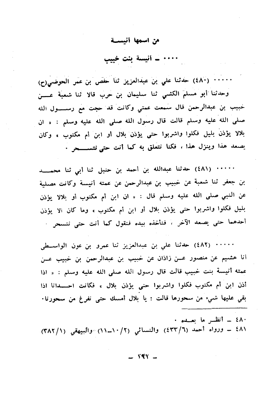 482 - حَدَّثَنَا عَبْدُ اللهِ بْنُ أَحْمَدَ بْنِ حَنْبَلٍ، ثنا أَبِي، ثنا مُحَمَّدُ بْنُ جَعْفَرٍ، ثنا شُعْبَةُ، عَنْ خُبَيْبِ بْنِ عَبْدِ الرَّحْمَنِ، عَنْ عَمَّتِهِ أُنَيْسَةَ وَكَانَتْ مُصَلِّيَةً، عَنِ النَّبِيِّ صَلَّى اللهُ عَلَيْهِ وَسَلَّمَ قَالَ: «§إِنَّ ابْنَ أُمِّ مَكْتُومٍ أَوْ بِلَالًا يُؤَذِّنُ بِلَيْلٍ، فَكُلُوا وَاشْرَبُوا حَتَّى يُؤَذِّنَ بِلَالٌ أَوِ ابْنُ أُمِّ مَكْتُومٍ» وَمَا كَانَ إِلَّا يُؤَذِّنُ أَحَدُهُمَا حَتَّى يَصْعَدَ الْآخَرُ فَنَأْخُذَهُ بِيَدِهِ فَنَقُولُ كَمَا أَنْتَ حَتَّى نَتَسَحَّرَ "
