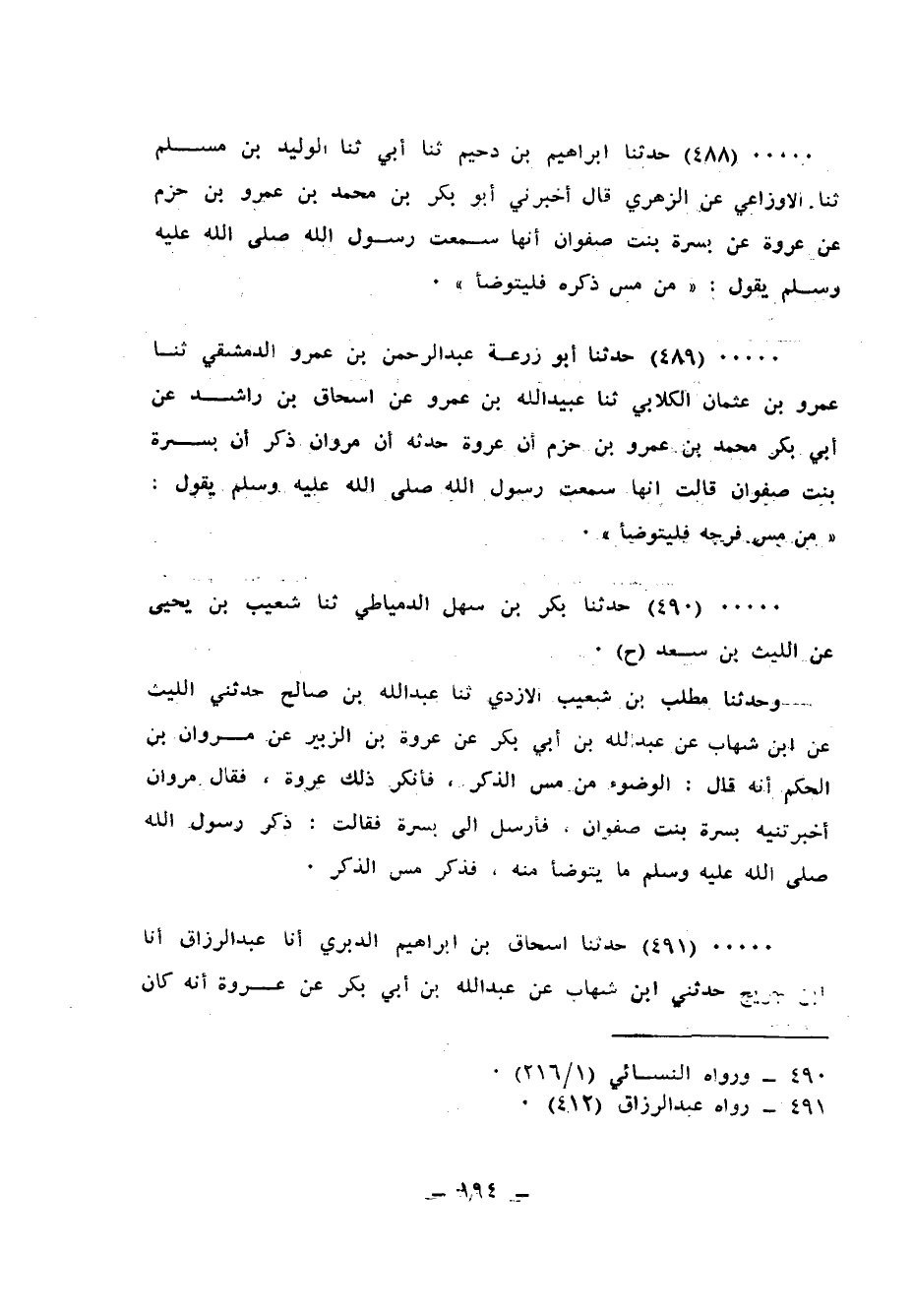 488 - حَدَّثَنَا إِبْرَاهِيمُ بْنُ دُحَيْمٍ، ثنا أَبِي، ثنا الْوَلِيدُ بْنُ مُسْلِمٍ، ثنا الْأَوْزَاعِيُّ، عَنِ الزُّهْرِيِّ، قَالَ: أَخْبَرَنِي أَبُو بَكْرِ بْنُ مُحَمَّدِ بْنِ عَمْرِو بْنِ حَزْمٍ، عَنْ عُرْوَةَ، عَنْ بُسْرَةَ بِنْتِ صَفْوَانَ، أَنَّهَا سَمِعَتْ رَسُولَ اللهِ صَلَّى اللهُ عَلَيْهِ وَسَلَّمَ يَقُولُ: «§مَنْ مَسَّ ذَكَرَهُ فَلْيَتَوَضَّأْ»