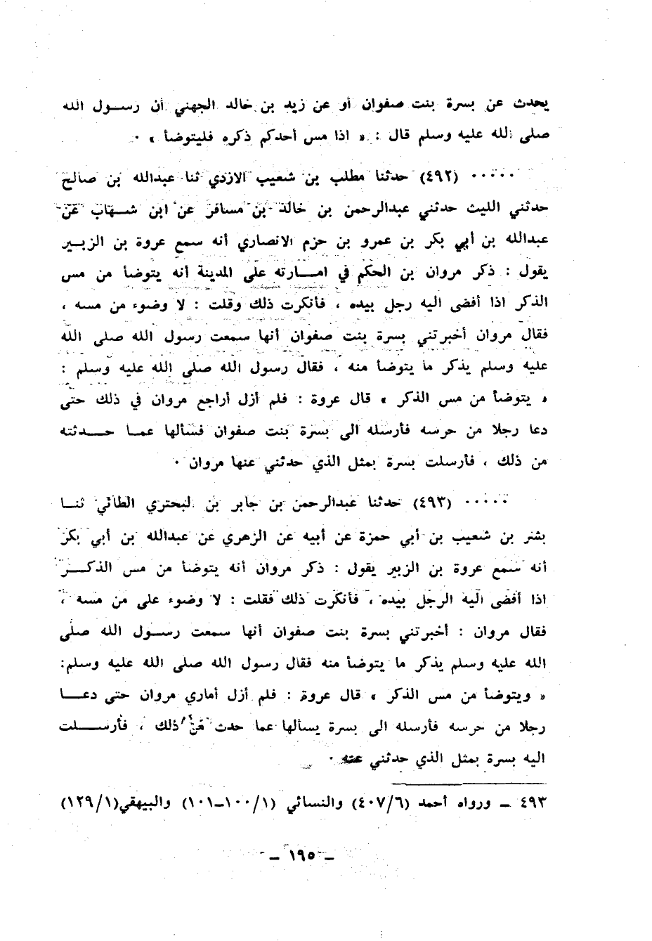 492 - حَدَّثَنَا مُطَّلِبُ بْنُ شُعَيْبٍ الْأَزْدِيُّ، ثنا عَبْدُ اللهِ بْنُ صَالِحٍ، حَدَّثَنِي اللَّيْثُ، حَدَّثَنِي عَبْدُ الرَّحْمَنِ بْنُ خَالِدِ بْنِ مُسَافِرٍ، عَنِ ابْنِ شِهَابٍ، عَنْ عَبْدِ اللهِ بْنِ أَبِي بَكْرِ بْنِ عَمْرِو بْنِ حَزْمٍ الْأَنْصَارِيِّ، أَنَّهُ سَمِعَ عُرْوَةَ بْنِ الزُّبَيْرِ، يَقُولُ: ذَكَرَ مَرْوَانُ بْنُ الْحَكَمِ فِي إِمَارَتِهِ عَلَى الْمَدِينَةِ أَنَّهُ يُتَوَضَّأُ مِنْ مَسِّ الذَّكَرِ إِذَا أَفْضَى إِلَيْهِ رَجُلٌ بِيَدِهِ، فَأَنْكَرْتُ ذَلِكَ، وَقُلْتُ: لَا وُضُوءَ مِنْ مَسِّهِ، فَقَالَ مَرْوَانُ: أَخْبَرَتْنِي بُسْرَةُ بِنْتُ صَفْوَانَ، أَنَّهَا سَمِعَتْ رَسُولَ اللهِ صَلَّى اللهُ عَلَيْهِ وَسَلَّمَ يَذْكُرُ مَا يُتَوَضَّأُ مِنْهُ، فَقَالَ رَسُولُ اللهِ صَلَّى اللهُ عَلَيْهِ وَسَلَّمَ: «§يُتَوَضَّأُ مِنْ مَسِّ الذَّكَرِ» قَالَ عُرْوَةُ: «فَلَمْ أَزَلْ أُرَاجِعُ مَرْوَانَ فِي ذَلِكَ حَتَّى دَعَا رَجُلًا مِنْ حَرَسِهِ فَأَرْسَلَهُ إِلَى بُسْرَةَ بِنْتِ صَفْوَانَ فَسَأَلَهَا عَمَّا حَدَّثَتْهُ مِنْ ذَلِكَ فَأَرْسَلَتْ بُسْرَةُ بِمِثْلِ الَّذِي حَدَّثَنِي عَنْهَا مَرْوَانُ»