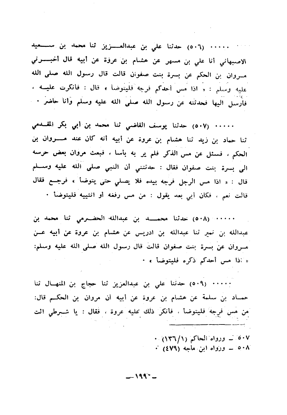 506 - حَدَّثَنَا عَلِيُّ بْنُ عَبْدِ الْعَزِيزِ، ثنا مُحَمَّدُ بْنُ سَعِيدِ بْنِ الْأَصْبَهَانِيِّ، أَنَا عَلِيُّ بْنُ مُسْهِرٍ، عَنْ هِشَامِ بْنِ عُرْوَةَ، عَنْ أَبِيهِ، قَالَ: أَخْبَرَنِي مَرْوَانُ بْنُ الْحَكَمِ، عَنْ بُسْرَةَ بِنْتِ صَفْوَانَ، قَالَتْ: قَالَ رَسُولُ اللهِ صَلَّى اللهُ عَلَيْهِ وَسَلَّمَ: «§إِذَا مَسَّ أَحَدُكُمْ فَرْجَهُ فَلْيَتَوَضَّأْ» ، قَالَ: فَأَنْكَرْتُ عَلَيْهِ فَأَرْسَلَ إِلَيْهَا فَحَدَّثَتْهُ عَنْ رَسُولِ اللهِ صَلَّى اللهُ عَلَيْهِ وَسَلَّمَ، وَأَنَا حَاضِرٌ