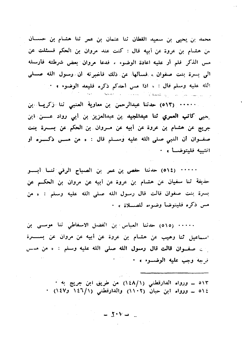 513 - حَدَّثَنَا عَبْدُ الرَّحْمَنِ بْنُ مُعَاوِيَةَ الْعُتْبِيُّ، ثنا زَكَرِيَّا بْنُ يَحْيَى، كَاتَبٍ الْعُمَرِيُّ، ثنا عَبْدُ الْمَجِيدِ بْنُ عَبْدِ الْعَزِيزِ بْنِ أَبِي رَوَّادٍ، عَنِ ابْنِ جُرَيْجٍ، عَنْ هِشَامِ بْنِ عُرْوَةَ، عَنْ أَبِيهِ، عَنْ مَرْوَانَ بْنِ الْحَكَمِ، عَنْ بُسْرَةَ بِنْتِ صَفْوَانَ، أَنَّ النَّبِيَّ صَلَّى اللهُ عَلَيْهِ وَسَلَّمَ قَالَ: «§مَنْ مَسَّ ذَكَرَهُ أَوْ أُنْثَيَيْهِ فَلْيَتَوَضَّأْ»