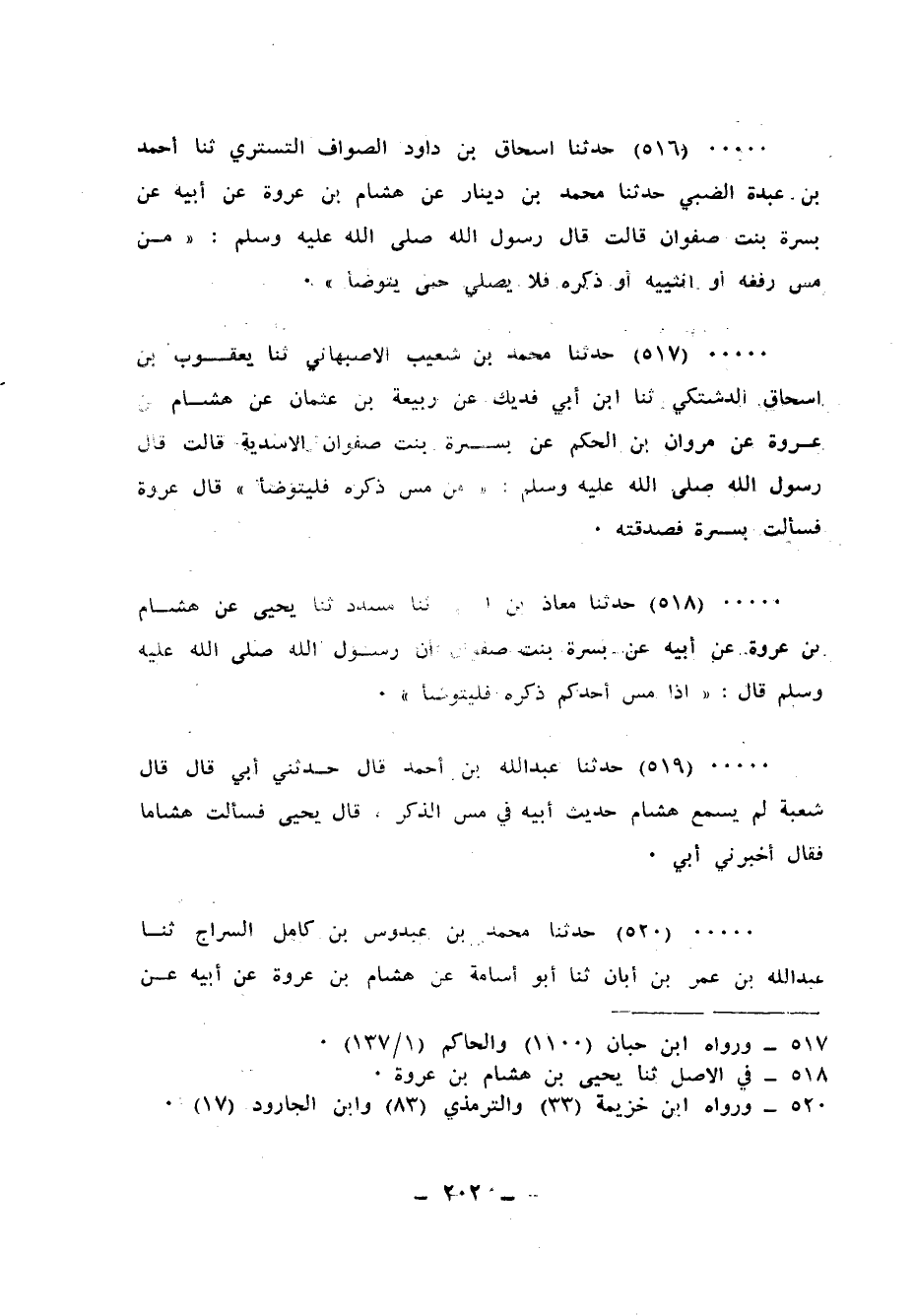 520 - حَدَّثَنَا مُحَمَّدُ بْنُ عَبْدُوسِ بْنِ كَامِلٍ السِّرَاجُ، ثنا عَبْدُ اللهِ بْنُ عُمَرَ بْنِ أَبَانَ، ثنا أَبُو أُسَامَةَ، عَنْ هِشَامِ بْنِ عُرْوَةَ، عَنْ أَبِيهِ، عَنْ مَرْوَانَ، عَنْ بُسْرَةَ بِنْتِ صَفْوَانَ، قَالَتْ: سَمِعْتُ رَسُولَ اللهِ صَلَّى اللهُ عَلَيْهِ وَسَلَّمَ يَقُولُ: «§إِذَا مَسَّ أَحَدُكُمْ ذَكَرَهُ فَلْيَتَوَضَّأْ»