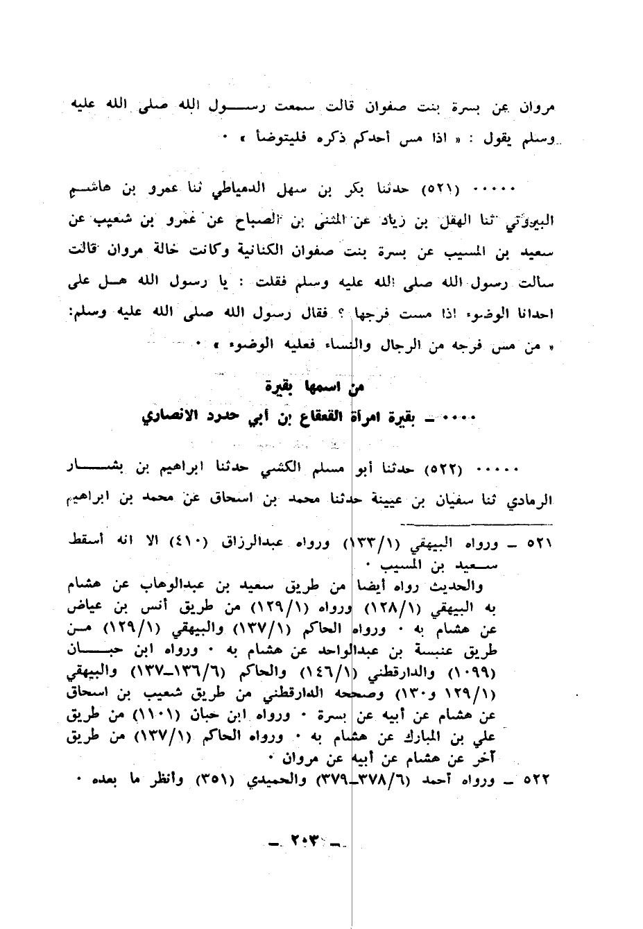 521 - حَدَّثَنَا بَكْرُ بْنُ سَهْلٍ الدِّمْياطِيُّ، ثنا عَمْرُو بْنُ هَاشِمٍ الْبَيْرُوتِيُّ، ثنا الْهِقْلُ بْنُ زِيَادٍ، عَنِ الْمُثَنَّى بْنِ الصَّبَّاحِ، عَنْ عَمْرِو بْنِ شُعَيْبٍ، عَنْ سَعِيدِ بْنِ الْمُسَيِّبِ، عَنْ بُسْرَةَ بِنْتِ صَفْوَانَ الْكِنانِيَّةِ، وَكَانَتْ خَالَةُ مَرْوَانَ، قَالَتْ: سَأَلْتُ رَسُولَ اللهِ صَلَّى اللهُ عَلَيْهِ وَسَلَّمَ، فَقُلْتُ: يَا رَسُولَ اللهِ هَلْ عَلَى إِحْدَانَا الْوُضُوءُ إِذَا مَسَّتْ فَرْجَهَا؟، فَقَالَ رَسُولُ اللهِ صَلَّى اللهُ عَلَيْهِ وَسَلَّمَ: «§مَنْ مَسَّ فَرْجَهُ مِنَ الرِّجَالِ، وَالنِّسَاءِ فَعَلَيْهِ الْوُضُوءُ»