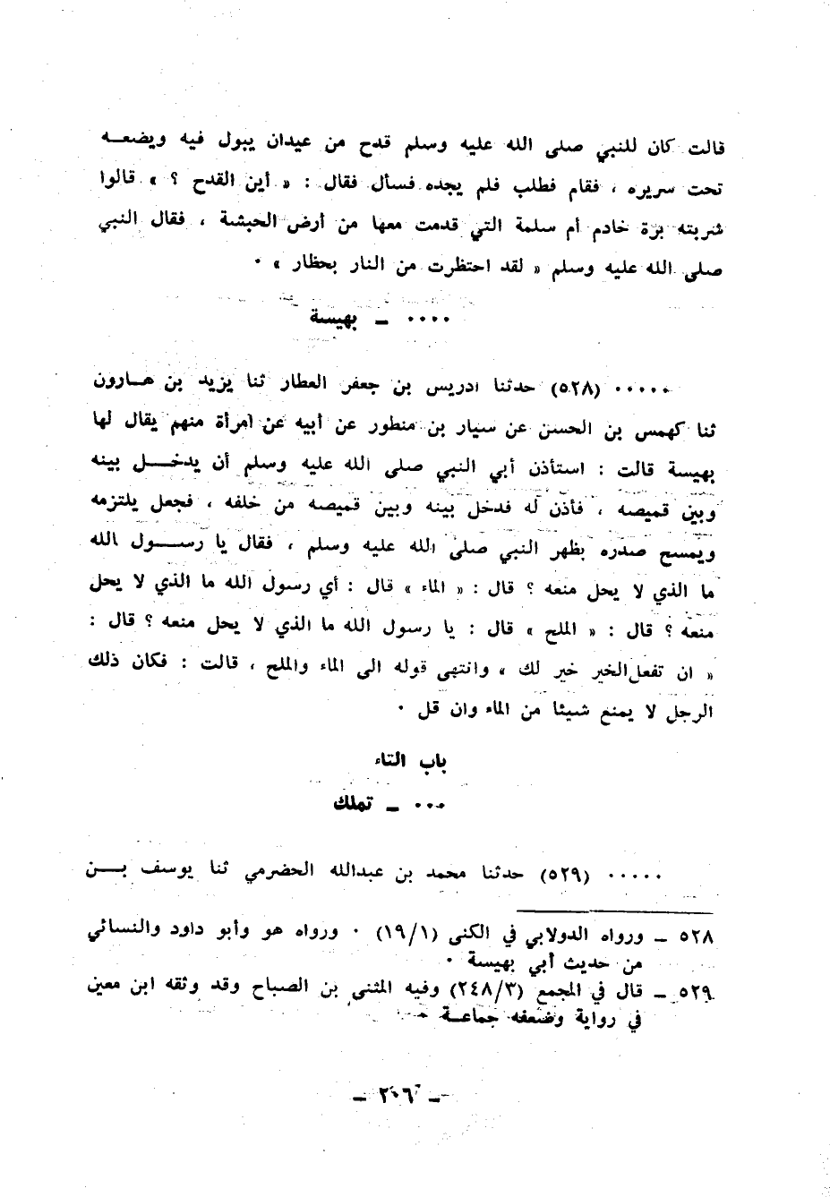 528 - حَدَّثَنَا إِدْرِيسُ بْنُ جَعْفَرٍ الْعَطَّارُ، ثنا يَزِيدُ بْنُ هَارُونَ، ثنا كَهْمَسُ بْنُ الْحَسَنِ، عَنْ سَيَّارِ بْنِ مَنْظُورٍ، عَنْ أَبِيهِ، عَنِ امْرَأَةٍ مِنْهُمْ يُقَالُ لَهَا بُهَيْسَةُ، قَالَتِ: اسْتَأْذَنَ أَبِي النَّبِيَّ صَلَّى اللهُ عَلَيْهِ وَسَلَّمَ، أَنْ يَدْخُلَ بَيْنَهُ وَبَيْنَ قَمِيصِهِ فَأَذِنَ لَهُ فَدَخَلَ بَيْنَهُ وَبَيْنَ قَمِيصِهِ مِنْ خَلْفَهِ فَجَعَلَ يَلْتَزِمُهُ، وَيَمْسَحُ صَدْرَهُ بِظَهْرِ النَّبِيِّ صَلَّى اللهُ عَلَيْهِ وَسَلَّمَ فَقَالَ: يَا رَسُولَ اللهِ مَا الَّذِي لَا يَحِلُّ مَنْعُهُ؟، قَالَ: " الْمَاءُ، قَالَ: أَيْ رَسُولَ اللهِ مَا الَّذِي لَا يَحِلُّ مَنْعُهُ؟، قَالَ: الْمِلْحُ قَالَ: يَا رَسُولَ اللهِ مَا الَّذِي لَا يَحِلُّ مَنْعُهُ؟، قَالَ: «إِنْ §تَفْعَلِ الْخَيْرَ خَيْرٌ لَكَ، وَانْتَهَى» قَوْلُهُ إِلَى الْمَاءِ، وَالْمِلْحِ، قَالَتْ: فَكَانَ ذَلِكَ الرَّجُلُ لَا يَمْنَعُ شَيْئًا مِنَ الْمَاءِ، وَإِنْ قَلَّ