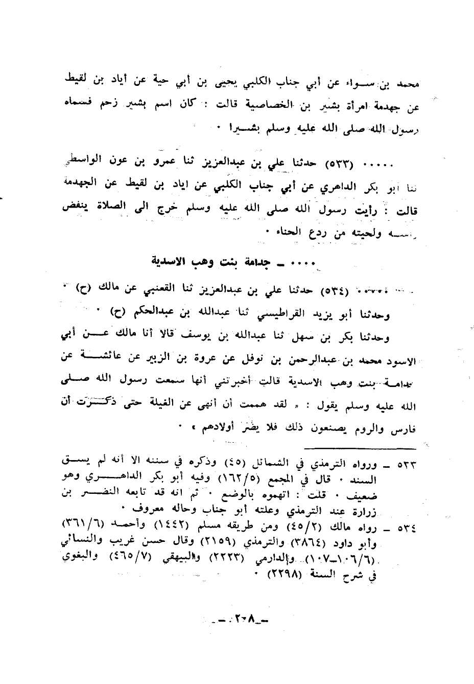 533 - حَدَّثَنَا عَلِيُّ بْنُ عَبْدِ الْعَزِيزِ، ثنا عَمْرُو بْنُ عَوْنٍ الْوَاسِطِيُّ، ثنا أَبُو بَكْرٍ الدَّاهِرِيُّ، عَنْ أَبِي جَنَابٍ الْكَلْبِيِّ، عَنْ إِيَادِ بْنِ لَقِيطٍ، عَنِ الْجَهْدَمَةِ، قَالَتْ: رَأَيْتُ رَسُولَ اللهِ صَلَّى اللهُ عَلَيْهِ وَسَلَّمَ: «§خَرَجَ إِلَى الصَّلَاةِ يَنْفُضُ رَأْسَهُ وَلِحْيَتَهُ مِنْ رَدْعِ الْحِنَّاءِ»