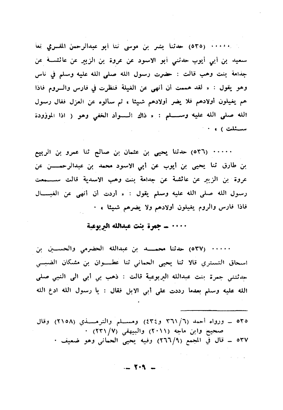 535 - حَدَّثَنَا بِشْرُ بْنُ مُوسَى، ثنا أَبُو عَبْدِ الرَّحْمَنِ الْمُقْرِئُ، ثنا سَعِيدُ بْنُ أَبِي أَيُّوبَ، حَدَّثَنِي أَبُو الْأَسْوَدِ، عَنْ عُرْوَةَ بْنِ الزُّبَيْرِ، عَنْ عَائِشَةَ، عَنْ جُذَامَةَ بِنْتِ وَهْبٍ، قَالَتْ: حَضَرْتُ رَسُولَ اللهِ صَلَّى اللهُ عَلَيْهِ وَسَلَّمَ فِي نَاسٍ وَهُوَ يَقُولُ: " §لَقَدْ هَمَمْتُ أَنْ أَنْهَى عَنِ الْغَيلَةِ فَنَظَرْتُ فِي فَارِسَ، وَالرُّومَ فَإِذَا هُمْ يُغِيلُونَ أَوْلَادَهُمْ فَلَا يَضُرُّ أَوْلَادَهُمْ شَيْئًا، ثُمَّ سَأَلُوهُ عَنِ الْعَزْلِ فَقَالَ رَسُولُ اللهِ صَلَّى اللهُ عَلَيْهِ وَسَلَّمَ: ذَاكَ الْوَأْدُ الْخَفِيُّ، وَهُوَ (إِذَا الْمَوْءُودَةُ سُئِلَتْ) "