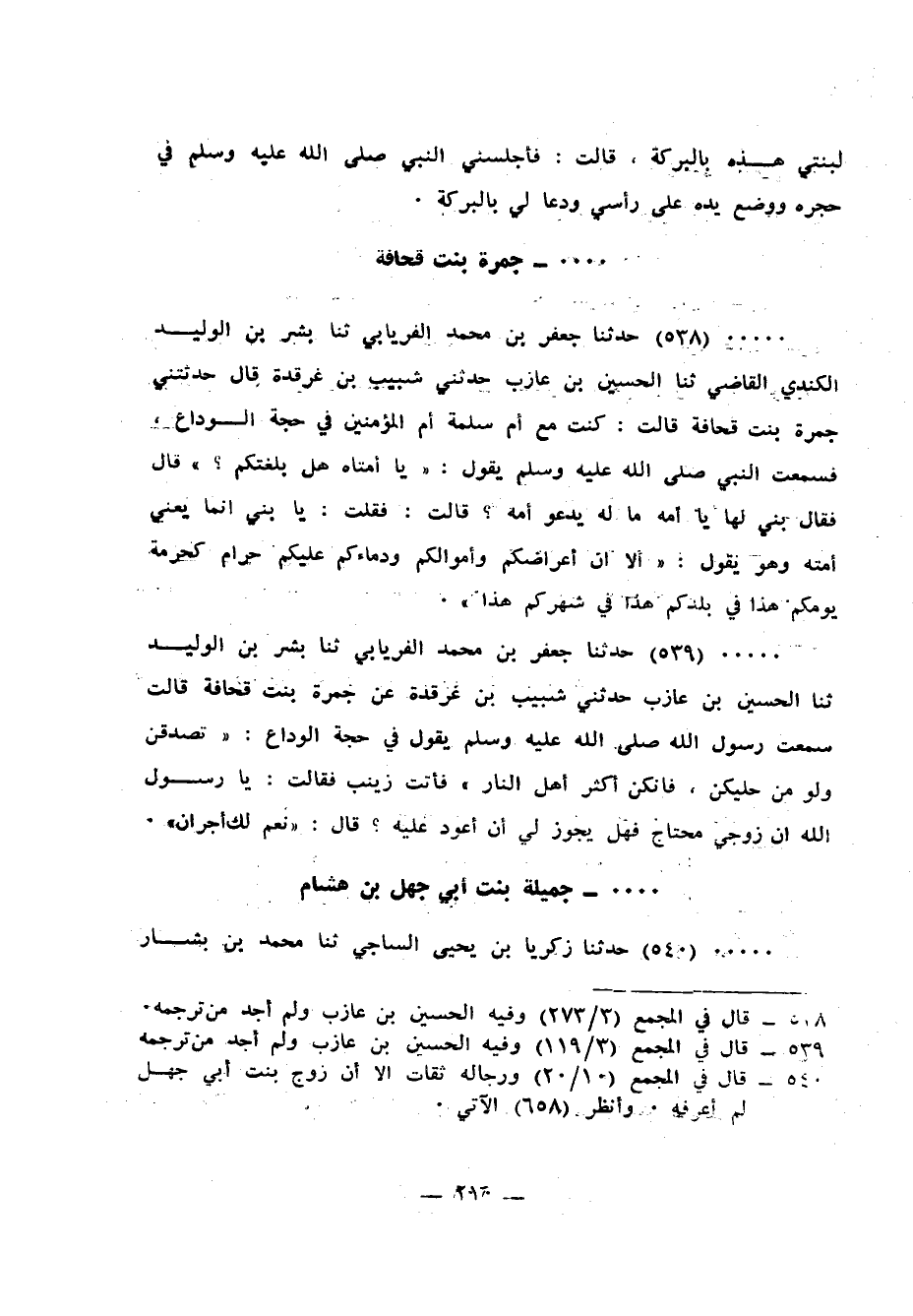 538 - حَدَّثَنَا جَعْفَرُ بْنُ مُحَمَّدٍ الْفِرْيَابِيُّ، ثنا بِشْرُ بْنُ الْوَلِيدِ الْكِنْدِيُّ الْقَاضِي، ثنا الْحُسَيْنُ بْنُ عَازِبٍ، حَدَّثَنِي شَبِيبُ بْنُ غَرْقَدَةَ، قَالَ: حَدَّثَتْنِي جَمْرَةُ بِنْتُ قُحَافَةَ، قَالَتْ: كُنْتُ مَعَ أُمِّ سَلَمَةَ أُمِّ الْمُؤْمِنِينَ فِي حَجَّةِ الْوَدَاعِ فَسَمِعْتُ النَّبِيَّ صَلَّى اللهُ عَلَيْهِ وَسَلَّمَ يَقُولُ: " §يَا أُمَّتَاهُ هَلْ بَلَّغْتُكُمْ؟، قَالَ: فَقَالَ بُنَيٌّ لَهَا: يَا أُمَّهْ مَا لَهُ يَدْعُو أُمَّهُ؟ قَالَتْ: فَقُلْتُ: يَا بُنَيُّ إِنَّمَا يَعْنِي أُمَّتَهُ، وَهُوَ يَقُولُ: «أَلَا إِنَّ أَعْرَاضَكُمْ وَأَمْوَالَكُمْ وَدِمَاءَكُمْ عَلَيْكُمْ حَرَامٌ، كَحُرْمَةِ يَوْمِكُمْ هَذَا، فِي بَلَدِكُمْ هَذَا، فِي شَهْرِكُمْ هَذَا»