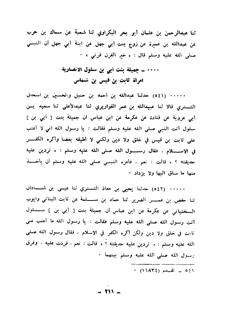 542 - حَدَّثَنَا يَحْيَى بْنُ مُعَاذٍ التُّسْتَرِيُّ، ثنا عِيسَى بْنُ شَاذَانَ، ثنا حَفْصُ بْنُ عُمَرَ الضَّرِيرُ، ثنا حَمَّادُ بْنُ سَلَمَةَ، عَنْ ثَابِتٍ الْبُنَانِيِّ، وَأَيُّوبَ السَّخْتِيَانِيِّ، عَنْ عِكْرِمَةَ، عَنِ ابْنِ عَبَّاسٍ، أَنَّ جَمِيلَةَ بِنْتَ أُبَيِّ بْنِ سَلُولٍ، أَتَتْ رَسُولَ اللهِ صَلَّى اللهُ عَلَيْهِ وَسَلَّمَ فَقَالَتْ: يَا رَسُولَ اللهِ مَا أَعْتِبُ عَلَى ثَابِتٍ فِي خُلُقٍ، وَلَا دِينٍ، وَلَكِنْ أَكْرَهُ الْكُفْرَ فِي الْإِسْلَامِ، فَقَالَ رَسُولُ اللهِ صَلَّى اللهُ عَلَيْهِ وَسَلَّمَ: " §تَرُدِّينَ عَلَيْهِ حَدِيقَتَهُ؟، قَالَتْ: نَعَمْ فَرَدَّتْ عَلَيْهِ، وَفَرَّقَ رَسُولُ اللهِ صَلَّى اللهُ عَلَيْهِ وَسَلَّمَ بَيْنَهُمَا " -[212]- جَمِيلَةُ بِنْتُ ثَابِتِ بْنِ أَبِي الْأَفْلَحِ الْأَنْصَارِيِّ امْرَأَةُ عُمَرَ بْنِ الْخَطَّابِ.