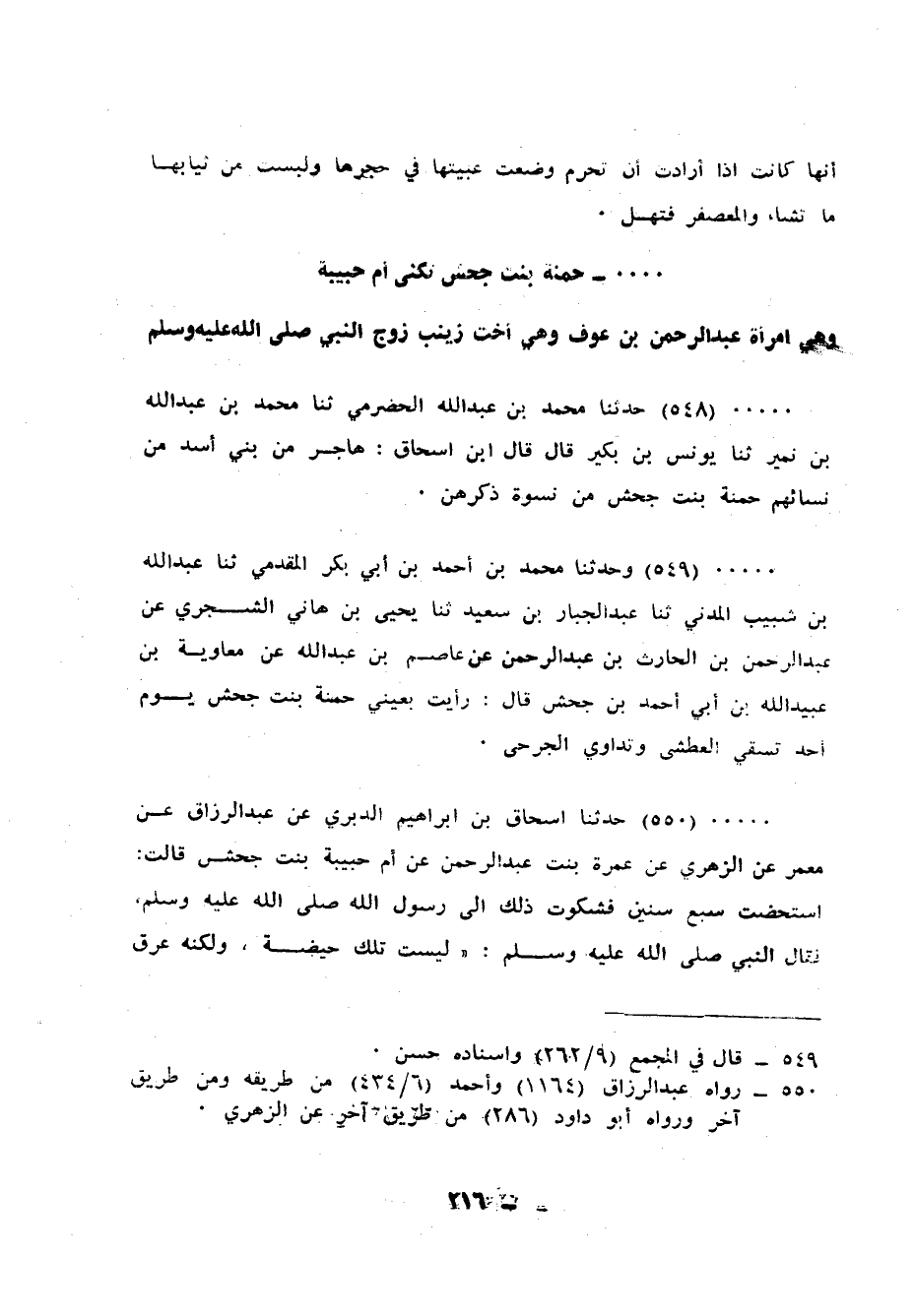 550 - حَدَّثَنَا إِسْحَاقُ بْنُ إِبْرَاهِيمَ الدَّبَرِيُّ، عَنْ عَبْدِ الرَّزَّاقِ، عَنْ مَعْمَرٍ، عَنِ الزُّهْرِيِّ، عَنْ عَمْرَةَ بِنْتِ عَبْدِ الرَّحْمَنِ، عَنْ أُمِّ حَبِيبَةَ بِنْتِ جَحْشٍ، قَالَتْ: اسْتُحِضْتُ سَبْعَ سِنِينَ فَشَكَوْتُ ذَلِكَ إِلَى رَسُولِ اللهِ صَلَّى اللهُ عَلَيْهِ وَسَلَّمَ فَقَالَ النَّبِيُّ صَلَّى اللهُ عَلَيْهِ وَسَلَّمَ: «§لَيْسَتْ تِلْكَ حَيْضَةٌ، وَلَكِنَّهُ عِرْقٌ فَاغْتَسِلِي» ، فَكَانَتْ تَغْتَسِلُ عِنْدَ كُلِّ صَلَاةٍ، وَكَانَتْ تَغْتَسِلُ فِي الْمِرْكَنِ فَتَرَى صُفْرَةَ الدَّمِ فِي الْمِرْكَنِ
