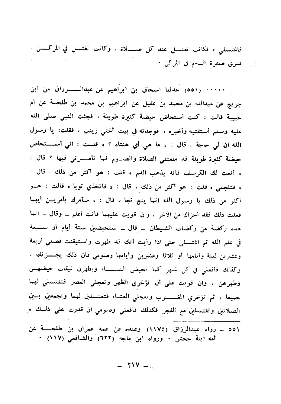 551 - حَدَّثَنَا إِسْحَاقُ بْنُ إِبْرَاهِيمَ، عَنْ عَبْدِ الرَّزَّاقِ، عَنِ ابْنِ جُرَيْجٍ، عَنْ عَبْدِ اللهِ بْنِ مُحَمَّدِ بْنِ عَقِيلٍ، عَنْ إِبْرَاهِيمَ بْنِ مُحَمَّدِ بْنِ طَلْحَةَ، عَنْ أُمِّ حَبِيبَةَ، قَالَتْ: كُنْتُ أُسْتَحَاضُ حَيْضَةً كَثِيرَةً طَوِيلَةً فَجِئْتُ النَّبِيَّ صَلَّى اللهُ عَلَيْهِ وَسَلَّمَ أَسْتَفْتِيهِ، وَأُخْبِرُهُ فَوَجَدْتُهُ فِي بَيْتِ أُخْتِي زَيْنَبَ فَقُلْتُ: يَا رَسُولَ اللهِ، إِنَّ لِي حَاجَةً، قَالَ: «مَا هِيَ أَيْ هَنْتَاهُ» ، قُلْتُ: إِنِّي أُسْتَحَاضُ حَيْضَةً كَثِيرَةً طَوِيلَةً قَدْ مَنَعَتْنِي الصَّلَاةَ وَالصَّوْمَ، فَمَا تَأْمُرُنِي فِيهَا؟ قَالَ: «أَنْعَتُ لَكِ الْكُرْسُفَ فَإِنَّهُ يُذْهِبُ الدَّمَ» قُلْتُ: هُوَ أَكْثَرُ مِنْ ذَلِكَ، قَالَ: «فَتَلَجَّمِي» قُلْتُ: هُوَ أَكْثَرُ مِنْ ذَلِكَ، قَالَ: «فَاتَّخِذِي ثَوْبًا» ، قَالَتْ: هُوَ أَكْثَرُ مِنْ ذَلِكَ يَا رَسُولَ اللهِ، إِنَّمَا يَثِجُّ ثَجًّا، قَالَ: «سَآمُرُكِ بِأَمْرَيْنِ أَيُّهُمَا فَعَلْتِ ذَلِكَ فَقَدْ أَجْزَأَكِ مِنَ الْآخَرِ، وَإِنْ قَوِيتِ عَلَيْهِمَا فَأَنْتِ أَعْلَمُ» ، وَقَالَ: «إِنَّمَا هَذِهِ رَكْضَةٌ مِنْ رَكَضَاتِ الشَّيْطَانِ» قَالَ: «§سَتَحِيضِينَ سِتَّةَ أَيَّامٍ أَوْ سَبْعَةً فِي عَلِمِ اللهِ، ثُمَّ اغْتَسِلِي حَتَّى إِذَا رَأَيْتِ أَنَّكِ قَدْ طَهُرْتِ وَاسْتَيْقَنْتِ فَصَلِّي أَرْبَعَةً، وَعِشْرِينَ لَيْلَةً، وَأَيَّامَهَا أَوْ ثَلَاثًا وَعِشْرِينَ، وَأَيَّامَهَا، وَصُومِي فَإِنَّ ذَلِكَ يُجْزِئُكِ، وَكَذَلِكَ فَافْعَلِي فِي كُلِّ شَهْرٍ كَمَا تَحِيضُ النِّسَاءُ، ويَطْهُرْنَ لِمِيقَاتِ حَيْضِهِنَّ، وَطُهْرِهِنَّ، وَإِنْ قَوِيتِ عَلَى أَنْ تُؤَخِّرِي الظُّهْرَ وَتُعَجِّلِي الْعَصْرَ فَتَغْتَسِلِي لَهُمَا جَمِيعًا، ثُمَّ تُؤَخِّرِي الْمَغْرِبَ وَتُعَجِّلِي الْعِشَاءَ فَتَغْتَسِلِينَ لَهُمَا وَتَجْمَعِينَ بَيْنَ الصَّلَاتَيْنِ وَتَغْتَسِلِينَ مَعَ الْفَجْرَ فَكَذَلِكَ فَافْعَلِي، وَصُومِي إِنْ قَدَرْتِ عَلَى ذَلِكَ» ، قَالَ رَسُولُ اللهِ صَلَّى اللهُ عَلَيْهِ وَسَلَّمَ: «وَهَذَا أَعْجَبُ الْأَمْرَيْنِ أَنْ تَلَجَّمِي» يَعْنِي تَسْتَثْفِرِي