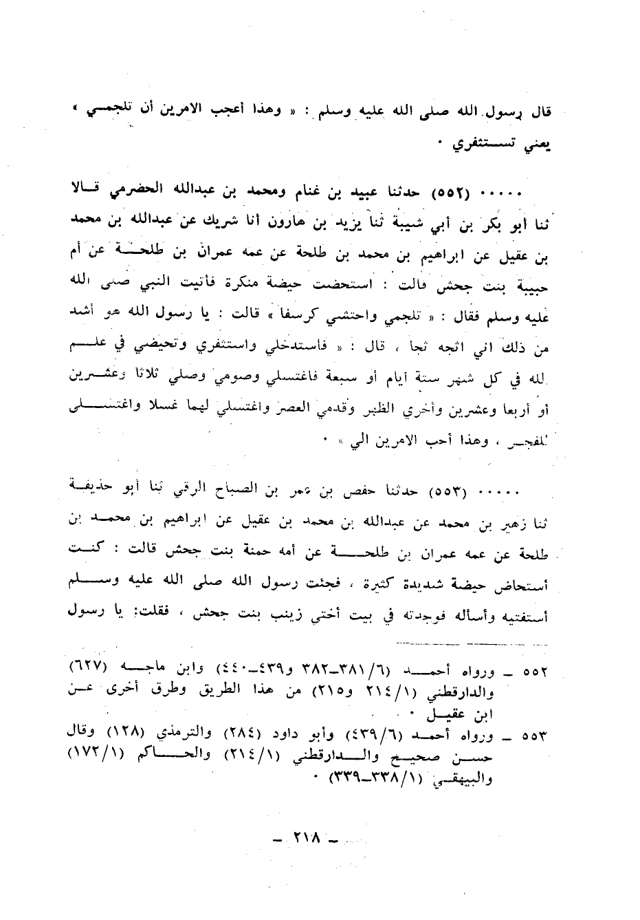 553 - حَدَّثَنَا حَفْصُ بْنُ عُمَرَ بْنِ الصَّبَّاحِ الرَّقِّيُّ، ثنا أَبُو حُذَيْفَةَ، ثنا زُهَيْرُ بْنُ مُحَمَّدٍ، عَنْ عَبْدِ اللهِ بْنِ مُحَمَّدِ بْنِ عَقِيلٍ، عَنْ إِبْرَاهِيمَ بْنِ مُحَمَّدِ بْنِ طَلْحَةَ، عَنْ عَمِّهِ عِمْرَانَ بْنِ طَلْحَةَ، عَنْ أُمِّهِ، حَمْنَةَ بِنْتِ جَحْشٍ، قَالَتْ: " كُنْتُ أُسْتَحَاضُ حَيْضَةً شَدِيدَةً كَثِيرَةً فَجِئْتُ رَسُولَ اللهِ صَلَّى اللهُ عَلَيْهِ وَسَلَّمَ أَسْتَفْتِيهِ، وَأَسْأَلُهُ فَوَجَدْتُهُ فِي بَيْتِ أُخْتِي زَيْنَبَ بِنْتِ جَحْشٍ فَقُلْتُ: يَا رَسُولَ اللهِ إِنَّ لِي إِلَيْكَ حَاجَةً قَالَ: " مَا هِيَ أَيْ هَنْتَاهُ قُلْتُ: يَا رَسُولَ اللهِ إِنَّهُ لِحَدِيثٌ وَاللهِ مَا مِنْهُ بُدٌّ وَإِنِّي لَأَسْتَحْيِي مِنْهُ قَالَ: فَمَا هُوَ أَيْ هَنْتَاهُ " قُلْتُ: يَا رَسُولَ اللهِ إِنِّي أُسْتَحَاضُ حَيْضَةً شَدِيدَةً كَثِيرَةً فَمَا تَرَى فِيهَا قَدْ مَنَعْتَنِي الصَّلَاةَ وَالصَّوْمَ، فَقَالَ لَهَا: «أَنْعَتُ لَكِ الْكُرْسُفَ فَإِنَّهُ يَذْهَبُ بِالدَّمِ» قُلْتُ: هُوَ أَكْثَرُ مِنْ ذَلِكَ، قَالَ: «§أَمَا إِنِّي سَآمُرُكِ بِأَمْرَيْنِ أَيُّهُمَا فَعَلْتِ فَقَدْ أَجْزَأَ عَنْكِ مِنَ الْآخَرِ، وَإِنْ قَدَرْتِ عَلَيْهِمَا فَأَنْتِ أَعْلَمُ إِنَّمَا هَذِهِ رَكْضَةٌ مِنْ رَكَضَاتِ الشَّيْطَانِ فَصَلِّي أَرْبَعَةً وَعِشْرِينَ لَيْلَةً، وَأَيَّامَهَا، وَصُومِي فَإِنَّ ذَلِكَ يُجْزِئُكِ، وَكَذَلِكَ فَافْعَلِي كُلَّ شَهْرٍ كَمَا تَحِيضُ النِّسَاءُ، وَكَمَا يَطْهُرْنَ لِمِيقَاتِ حَيْضِهِنَّ وَطُهْرِهِنَّ، وَإِنْ قَدَرْتِ عَلَى أَنْ تُؤَخِّرِي الظُّهْرَ، وَتُعَجِّلِي الْعَصْرَ، وَتَغْتَسِلِينَ لَهُمَا، ثُمَّ تُصَلِّيَنَ الظُّهْرَ، وَالْعَصْرَ جَمِيعًا، ثُمَّ تُؤَخِّرِي الْمَغْرِبَ وَتُعَجِّلِينَ الْعِشَاءَ، وَتَجْمَعِينَ بَيْنَ الصَّلَاتَيْنِ فَافْعَلِي، وَتَغْتَسِلِينَ مَعَ الْفَجْرِ غُسْلًا وَتُصَلِّينَ كَذَلِكَ فَافْعَلِي وَصَلِّي وَصُومِي إِنْ قَدَرْتِ عَلَى ذَلِكَ» قَالَ رَسُولُ اللهِ صَلَّى اللهُ عَلَيْهِ وَسَلَّمَ: «وَهَذَا أَعْجَبُ إِلَيَّ»