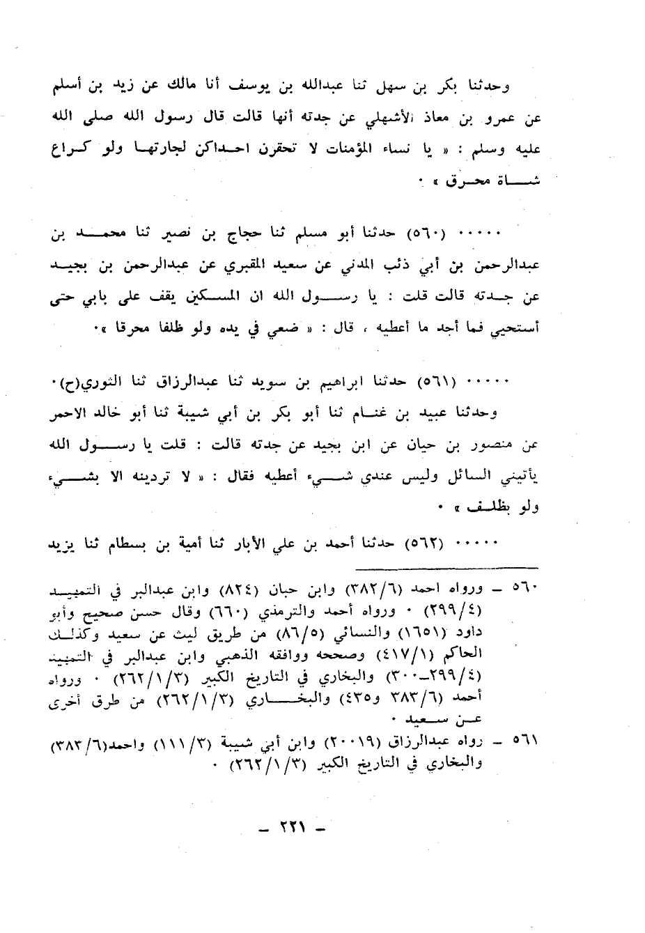 560 - حَدَّثَنَا أَبُو مُسْلِمٍ، ثنا حَجَّاجُ بْنُ نُصَيْرٍ، ثنا مُحَمَّدُ بْنُ عَبْدِ الرَّحْمَنِ بْنِ أَبِي ذِئْبٍ الْمَدَنِيُّ، عَنْ سَعِيدٍ الْمَقْبُرِيِّ، عَنْ عَبْدِ الرَّحْمَنِ بْنِ بُجَيْدٍ، عَنْ جَدَّتِهِ، قَالَتْ: قُلْتُ يَا رَسُولَ اللهِ إِنَّ الْمِسْكِينَ يَقِفُ عَلَى بَابِي حَتَّى أَسْتَحْيِي فَمَا أَجِدُ مَا أُعْطِيَهُ قَالَ: «§ضَعِي فِي يَدِهِ، وَلَوْ ظِلْفًا مُحْرَقًا»