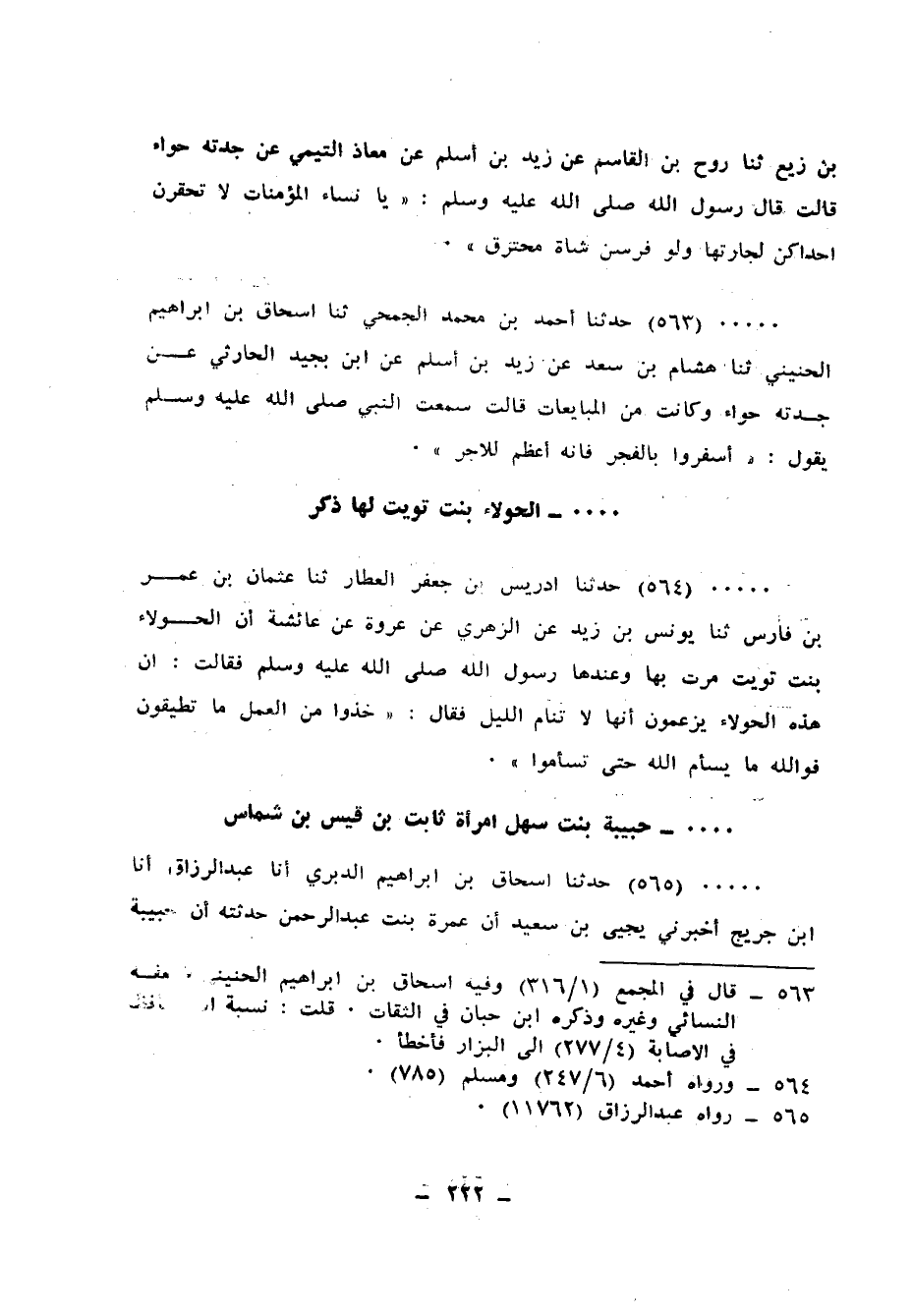 563 - حَدَّثَنَا أَحْمَدُ بْنُ مُحَمَّدٍ الْجُمَحِيُّ، ثنا إِسْحَاقُ بْنُ إِبْرَاهِيمَ الْحُنَيْنِيُّ، ثنا هِشَامُ بْنُ سَعْدٍ، عَنْ زَيْدِ بْنِ أَسْلَمَ، عَنِ ابْنِ بُجَيْدٍ الْحَارِثِيِّ، عَنْ جَدَّتِهِ حَوَّاءَ وَكَانَتْ مِنَ الْمُبَايِعَاتِ قَالَتْ: سَمِعْتُ النَّبِيَّ صَلَّى اللهُ عَلَيْهِ وَسَلَّمَ يَقُولُ: «§أَسْفِرُوا بِالْفَجْرِ فَإِنَّهُ أَعْظَمُ لِلْأَجْرِ»