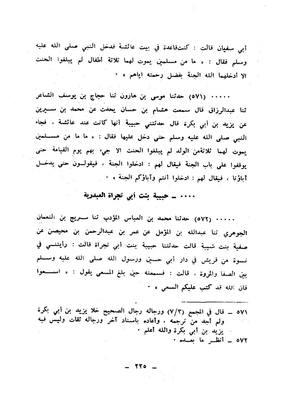 571 - حَدَّثَنَا مُوسَى بْنُ هَارُونَ، ثنا حَجَّاجُ بْنُ يُوسُفَ الشَّاعِرُ، ثنا عَبْدُ الرَّزَّاقِ، قَالَ: سَمِعْتُ هِشَامَ بْنَ حَسَّانَ، يُحَدِّثُ عَنْ مُحَمَّدِ بْنِ سِيرِينَ، عَنْ يَزِيدَ بْنِ أَبِي بَكْرَةَ، قَالَ: حَدَّثَتْنِي حَبِيبَةُ، أَنَّهَا: كَانَتْ عِنْدَ عَائِشَةَ، فَجَاءَ النَّبِيُّ صَلَّى اللهُ عَلَيْهِ وَسَلَّمَ حَتَّى دَخَلَ عَلَيْهَا فَقَالَ: «§مَا مَا مِنْ مُسْلِمَيْنِ يَمُوتُ لَهُمَا ثَلَاثَةٌ مِنَ الْوَلَدِ لَمْ يَبْلُغُوا الْحِنْثَ إِلَّا جِيءَ بِهِمْ يَوْمَ الْقِيَامَةِ حَتَّى يُوقَفُوا عَلَى بَابِ الْجَنَّةِ فَيُقَالُ لَهُمُ ادْخُلُوا الْجَنَّةَ فَيَقُولُونَ حَتَّى يَدْخُلَ آبَاؤُنَا فَيُقَالُ لَهُمِ ادْخُلُوا أَنْتُمْ وَآبَاؤُكُمُ الْجَنَّةَ»