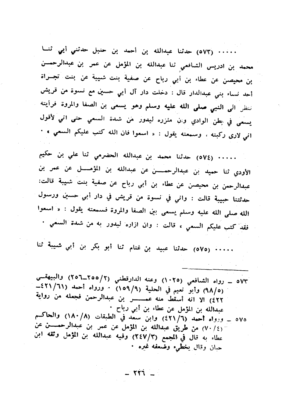 573 - حَدَّثَنَا عَبْدُ اللهِ بْنُ أَحْمَدَ بْنِ حَنْبَلٍ، حَدَّثَنِي أَبِي، ثنا مُحَمَّدُ بْنُ إِدْرِيسَ الشَّافِعِيُّ، ثنا عَبْدُ اللهِ بْنُ الْمُؤَمَّلِ، عَنْ عُمَرَ بْنِ عَبْدِ الرَّحْمَنِ بْنِ مَحِيضٍ، عَنْ عَطَاءِ بْنِ أَبِي رَبَاحٍ، عَنْ صَفِيَّةَ بِنْتِ شَيْبَةَ، عَنْ بِنْتِ تَجْرَاةَ، أَحَدِ نِسَاءِ بَنِي عَبْدِ الدَّارِ، قَالَ: دَخَلْتُ دَارَ آلِ أَبِي حُسَيْنٍ مَعَ نِسْوَةٍ مِنْ قُرَيْشٍ فَنَظَرَ إِلَيَّ النَّبِيُّ صَلَّى اللهُ عَلَيْهِ وَسَلَّمَ وَهُوَ يَسْعَى بَيْنَ الصَّفَا، وَالْمَرْوَةَ فَرَأَيْتُهُ يَسْعَى فِي بَطْنِ الْوَادِي وَإِنَّ مِئْزَرَهُ لَيَدُورُ مِنْ شِدَّةِ السَّعْيِ حَتَّى إِنِّي لَأَقُولُ إِنِّي لَأَرَى رُكْبَتِهِ وَسَمِعْتُهُ يَقُولُ: «§اسْعَوْا فَإِنَّ اللهَ كَتَبَ عَلَيْكُمُ السَّعْيَ»