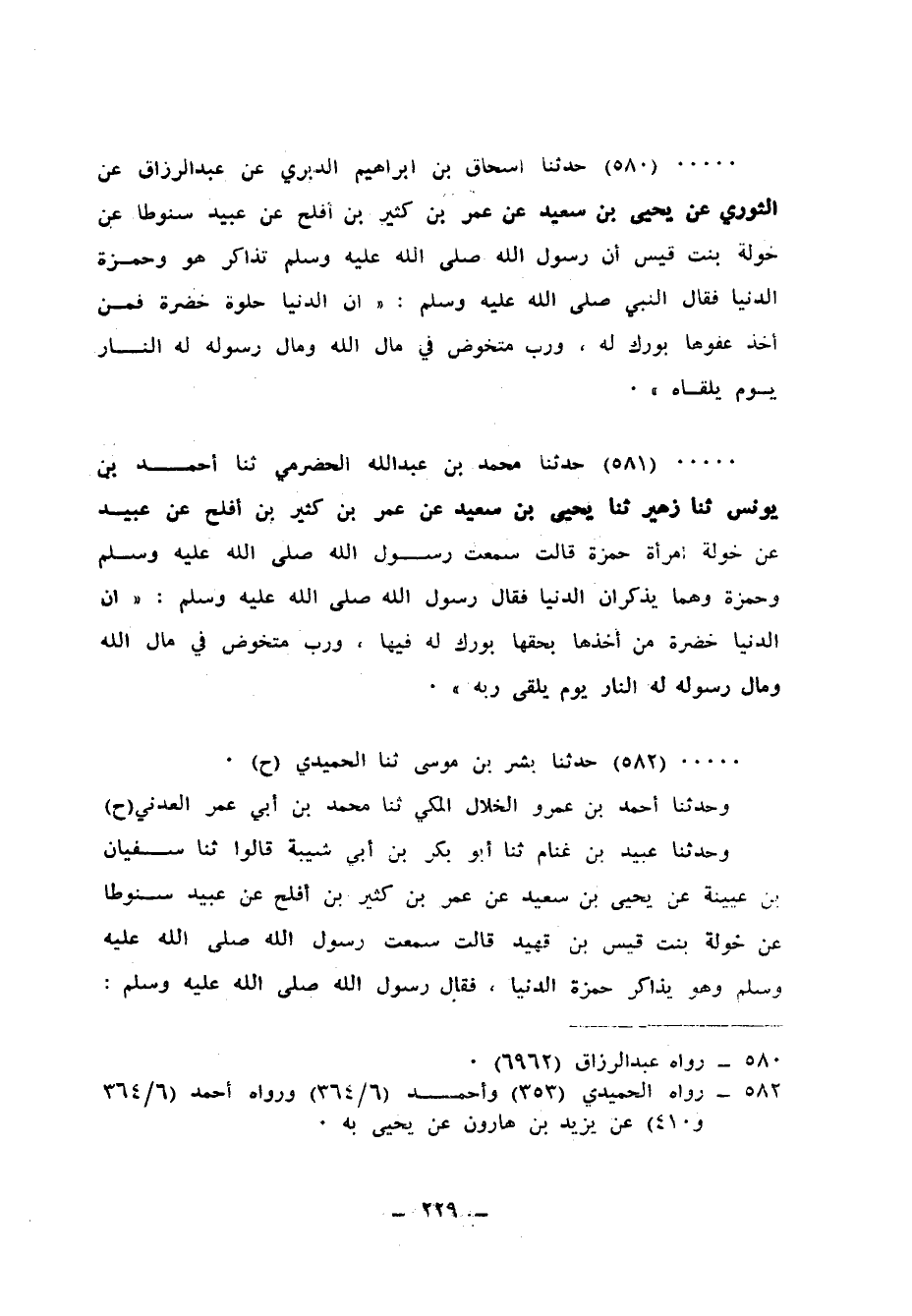 580 - حَدَّثَنَا إِسْحَاقُ بْنُ إِبْرَاهِيمَ الدَّبَرِيُّ، عَنْ عَبْدِ الرَّزَّاقِ، عَنِ الثَّوْرِيِّ، عَنْ يَحْيَى بْنِ سَعِيدٍ، عَنْ عُمَرِ بْنِ كَثِيرِ بْنِ أَفْلَحَ، عَنْ عُبَيْدِ سَنُوطَا، عَنْ خَوْلَةَ بِنْتِ قَيْسٍ، أَنَّ رَسُولَ اللهِ صَلَّى اللهُ عَلَيْهِ وَسَلَّمَ تَذَاكَرَ هُوَ وَحَمْزَةُ الدُّنْيَا فَقَالَ النَّبِيُّ صَلَّى اللهُ عَلَيْهِ وَسَلَّمَ: «إِنَّ §الدُّنْيَا حُلْوَةٌ خَضِرَةٌ فَمَنْ أَخَذَ عَفْوَها بُورِكَ لَهُ وَرُبَّ مُتَخَوِّضٍ فِي مَالِ اللهِ، وَمَالِ رَسُولِهِ لَهُ النَّارُ يَوْمَ يَلْقَاهُ»